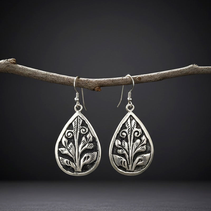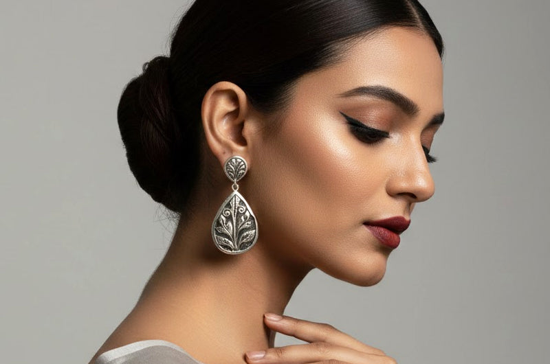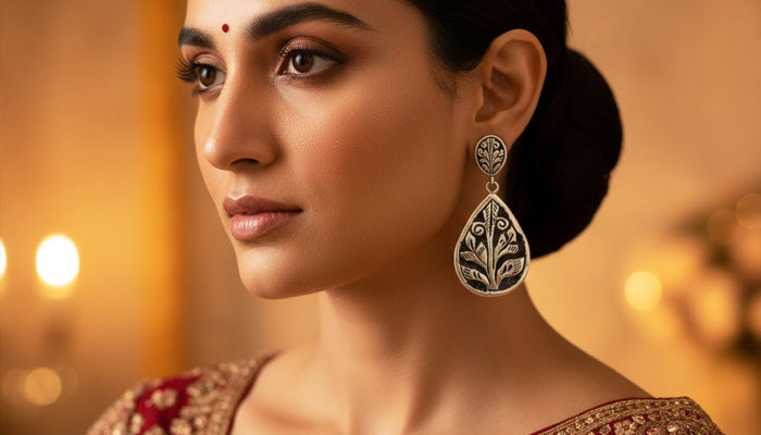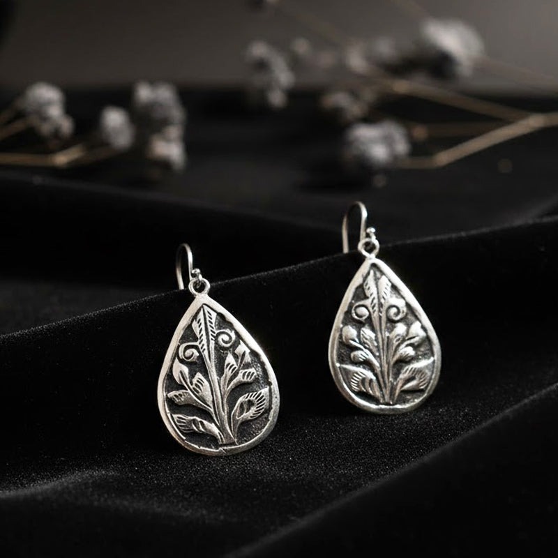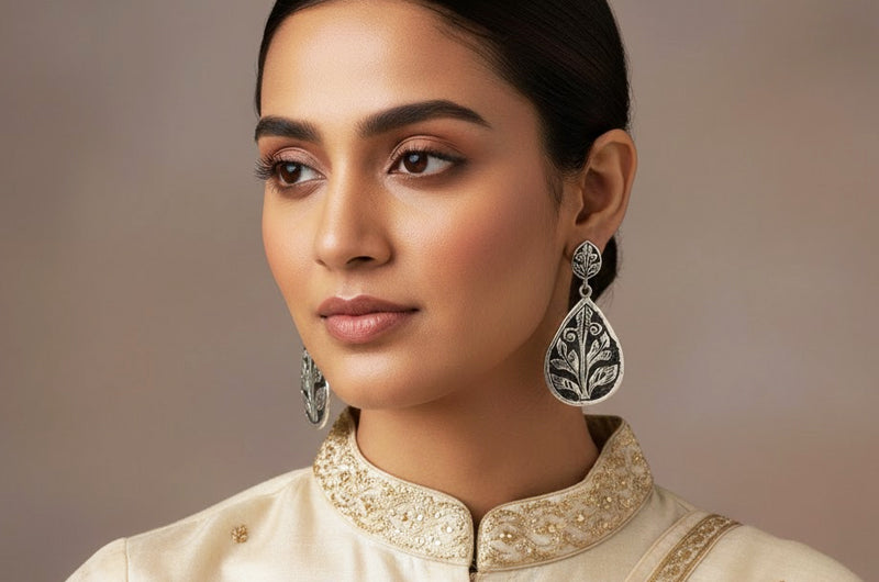 These silver earrings are inspired by the floral and leaf motifs engraved on the stone walls of the Baijnath Temple. The teardrop shape resembles traditional ritual shields, while the core leaf pattern represents growth and protection in pahadi ideology. Instead of sharp geometry, the smooth curves resemble temple embellishment. The earrings, made completely of silver, exude a sense of peace and stability. Perfect for heritage fashion, cultural attire, and everyday classic elegance.