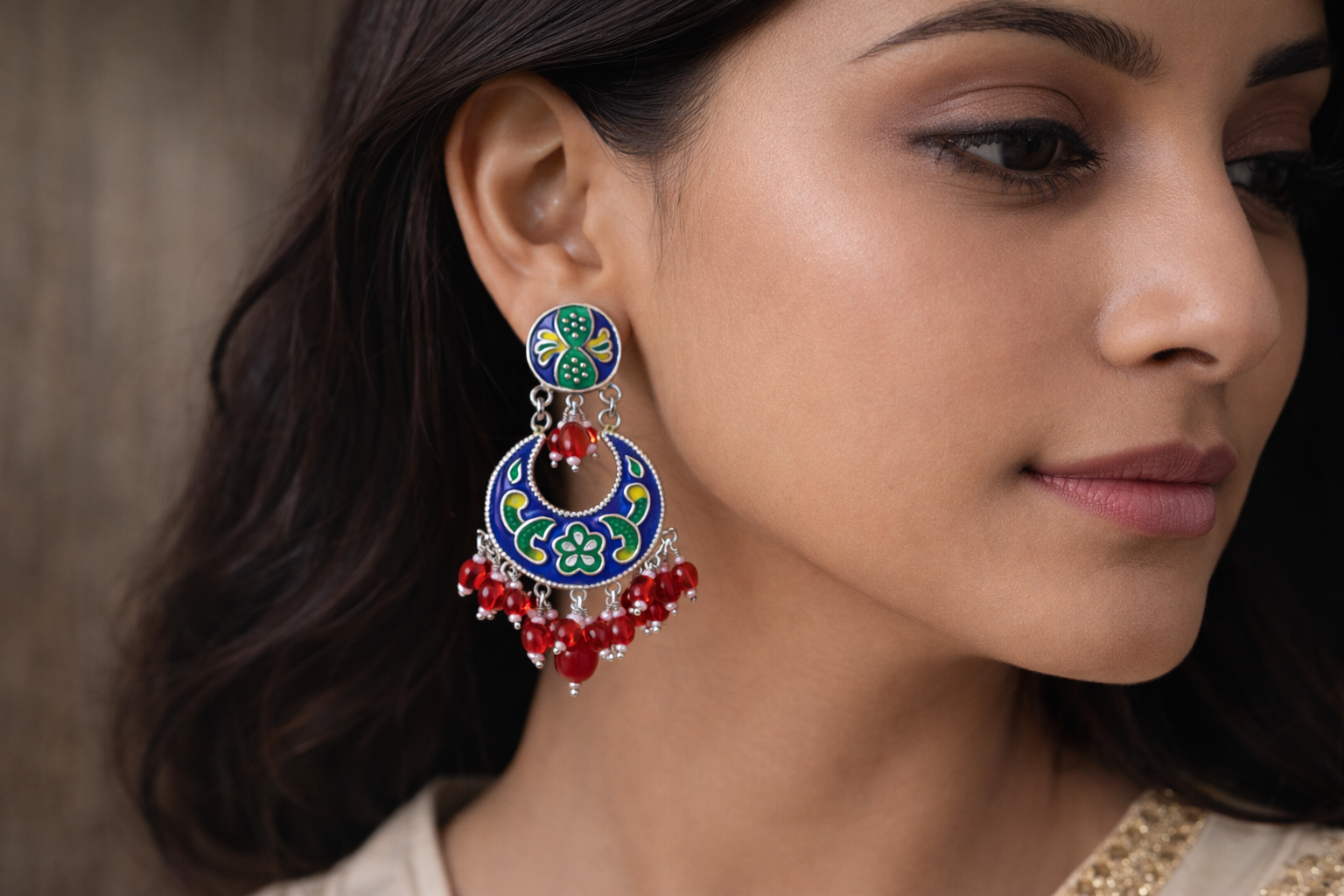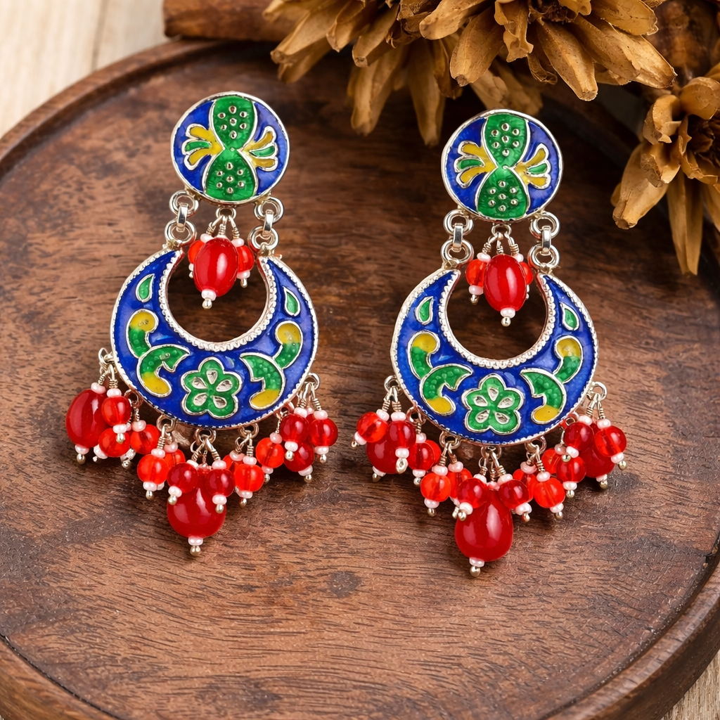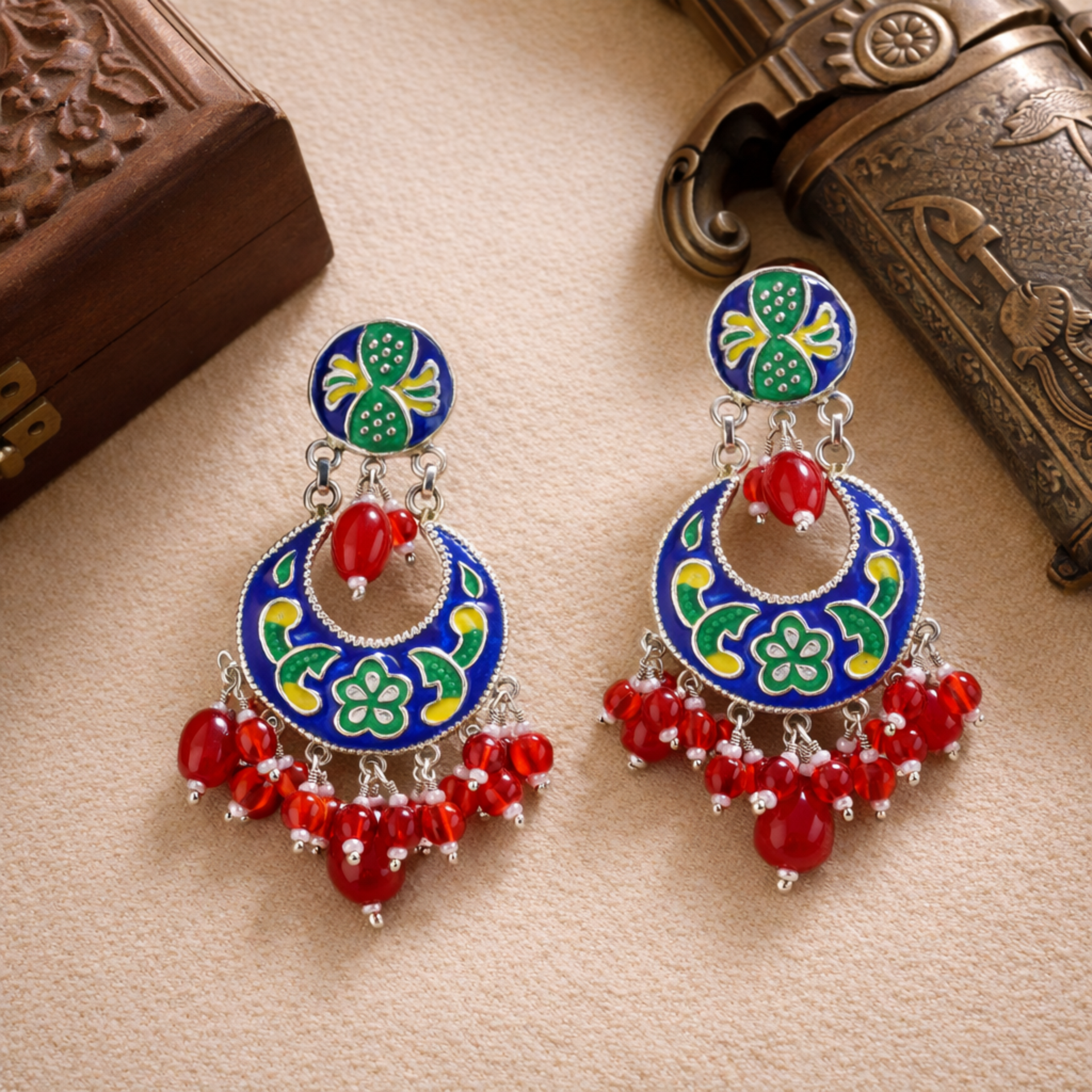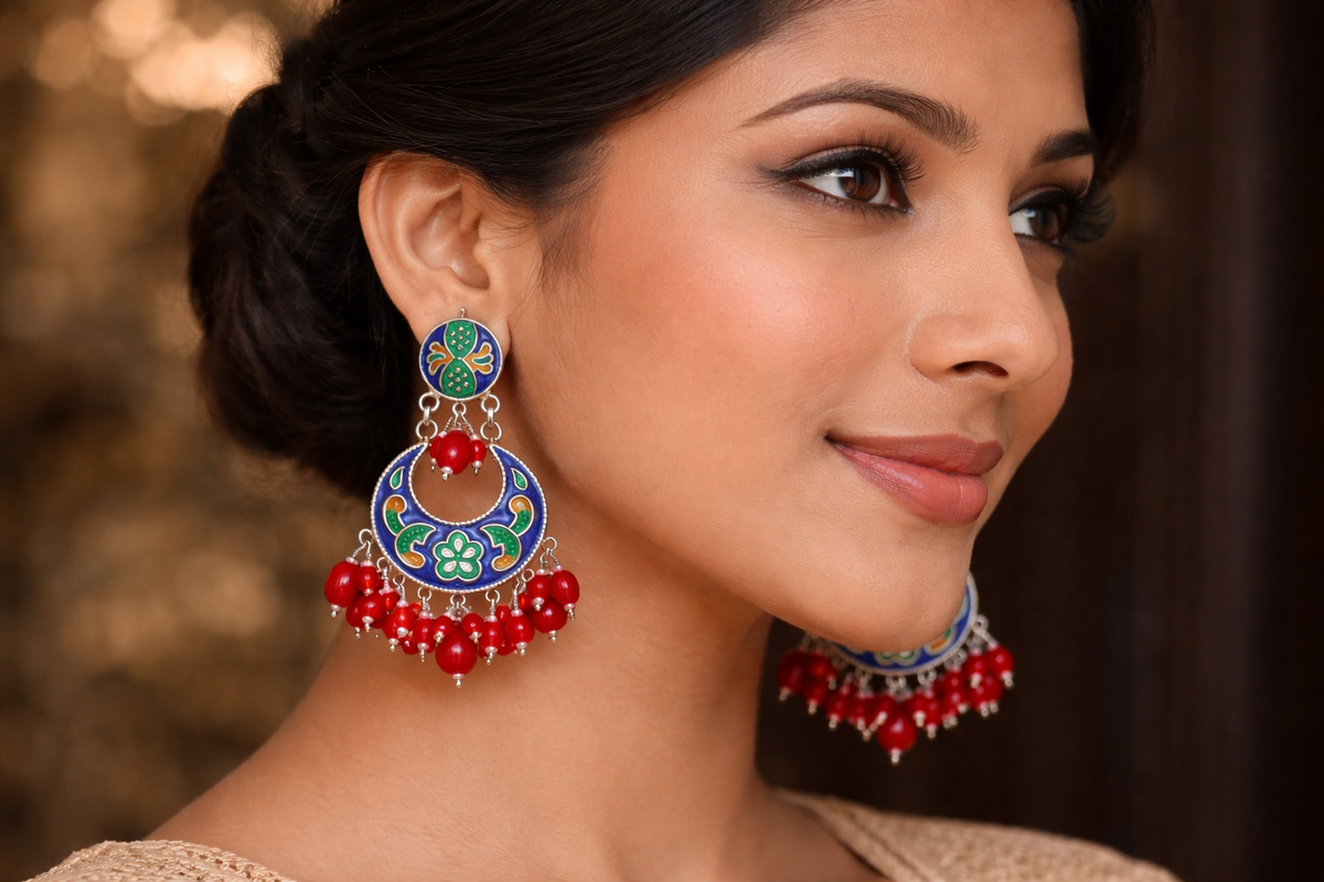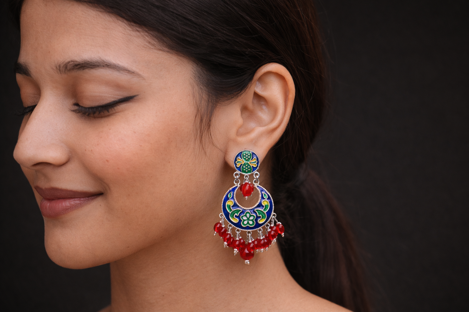 Inspired by the Buransh flower, a cherished symbol of Uttarakhand, this design celebrates mountain vitality and festivity. The deep blue represents the vast Himalayan sky, while red signifies joy, strength, and celebration. Such vibrant earrings complement traditional Pahadi attire during weddings and local festivals. The crescent motif reflects age-old jewelry patterns seen in Garhwali and Kumaoni adornments. A true reflection of Devbhoomi’s colorful cultural heritage.