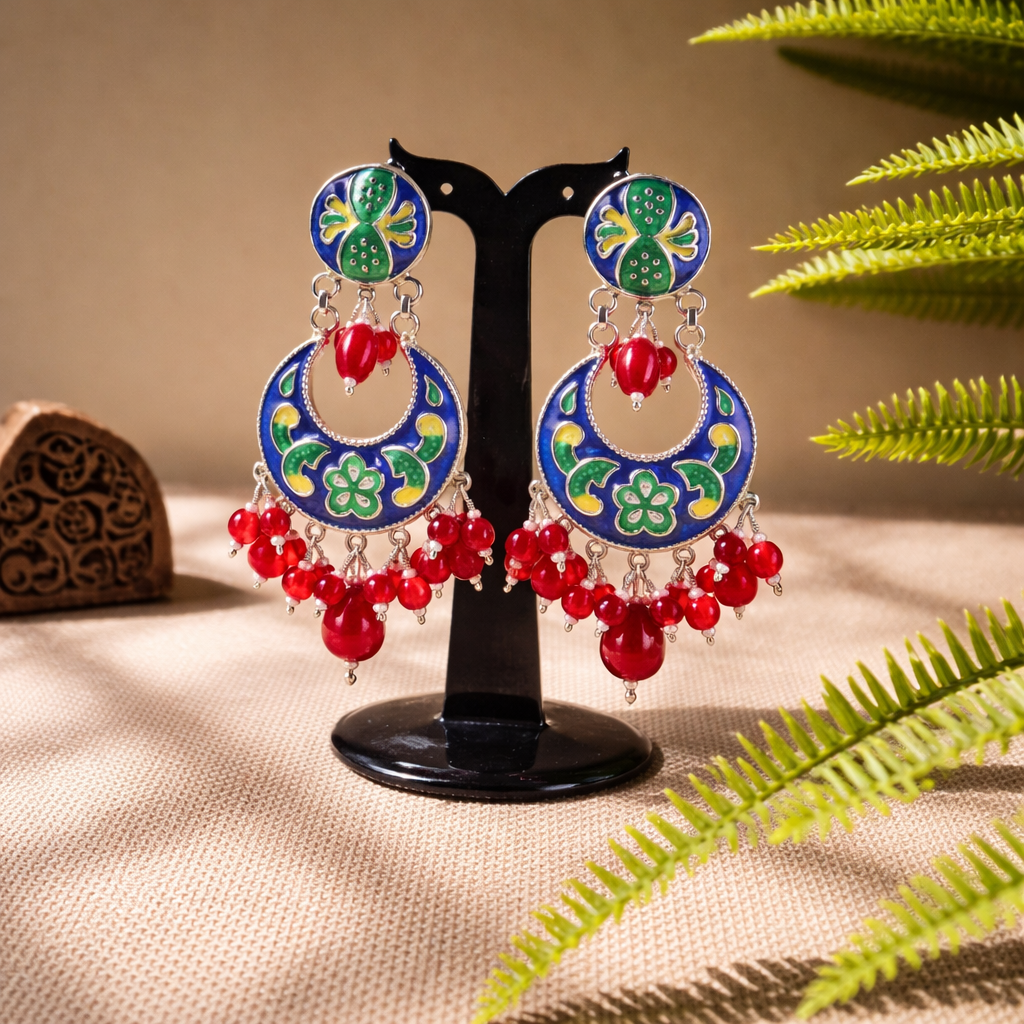 Vibrant blue meenakari jhumkas adorned with bold red bead clusters inspired by Uttarakhand’s Buransh bloom.