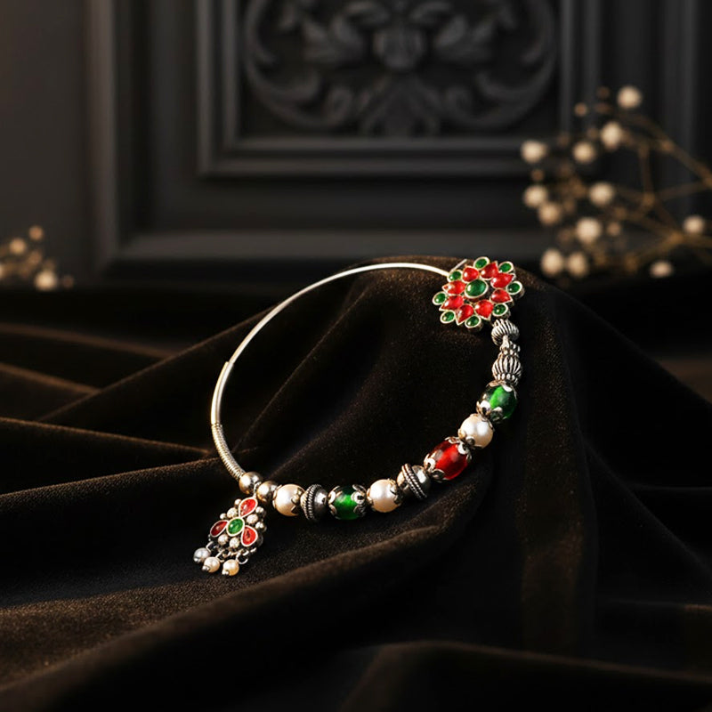 Worn as a mark of celebration and identity in UttarakhandÂ’s hill festivals, this nath reflects joy, auspiciousness, and tradition. The red and green stones symbolize vitality and prosperity, while the floral stud and rhythmic hangings echo ceremonial adornments deeply rooted in pahadi cultural practices.