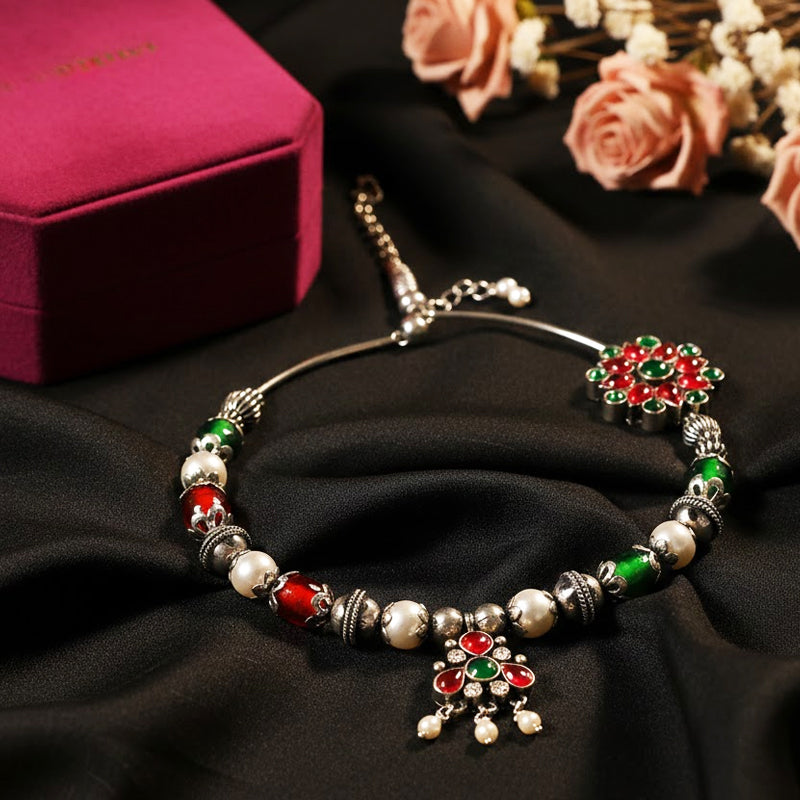 Stone-Studded Silver Nath with Red and Green Accents