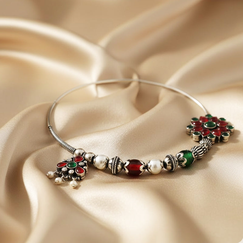 This silver nath, inspired by ceremonial jewellery used during hill celebrations, is adorned with brilliant red and green stones in classic pahadi designs. The floral stud evokes ceremonial flower arrangements, and the bead-set arc depicts ancient handcraft skills. Hanging silver elements create movement and joyous rhythm. The balanced curve provides both comfort and authenticity. Crafted entirely in silver, this nath has a strong heritage charm.