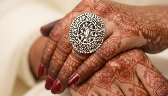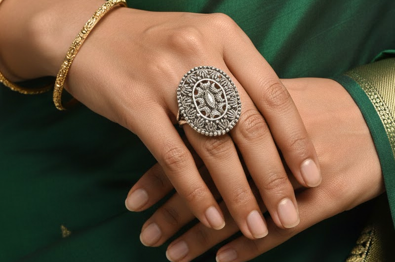 Handcrafted by skilled Pahadi silversmiths, the ring features precise layering, framing, and texturing. Each element preserves traditional hill techniques, transforming functional folk motifs into a durable, wearable piece that celebrates Uttarakhand’s artisanal heritage and cultural values.