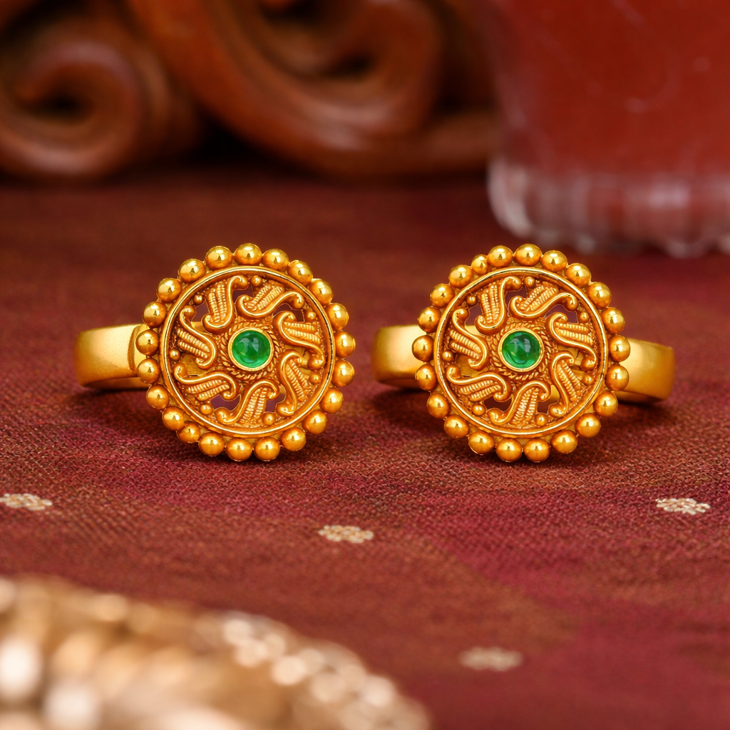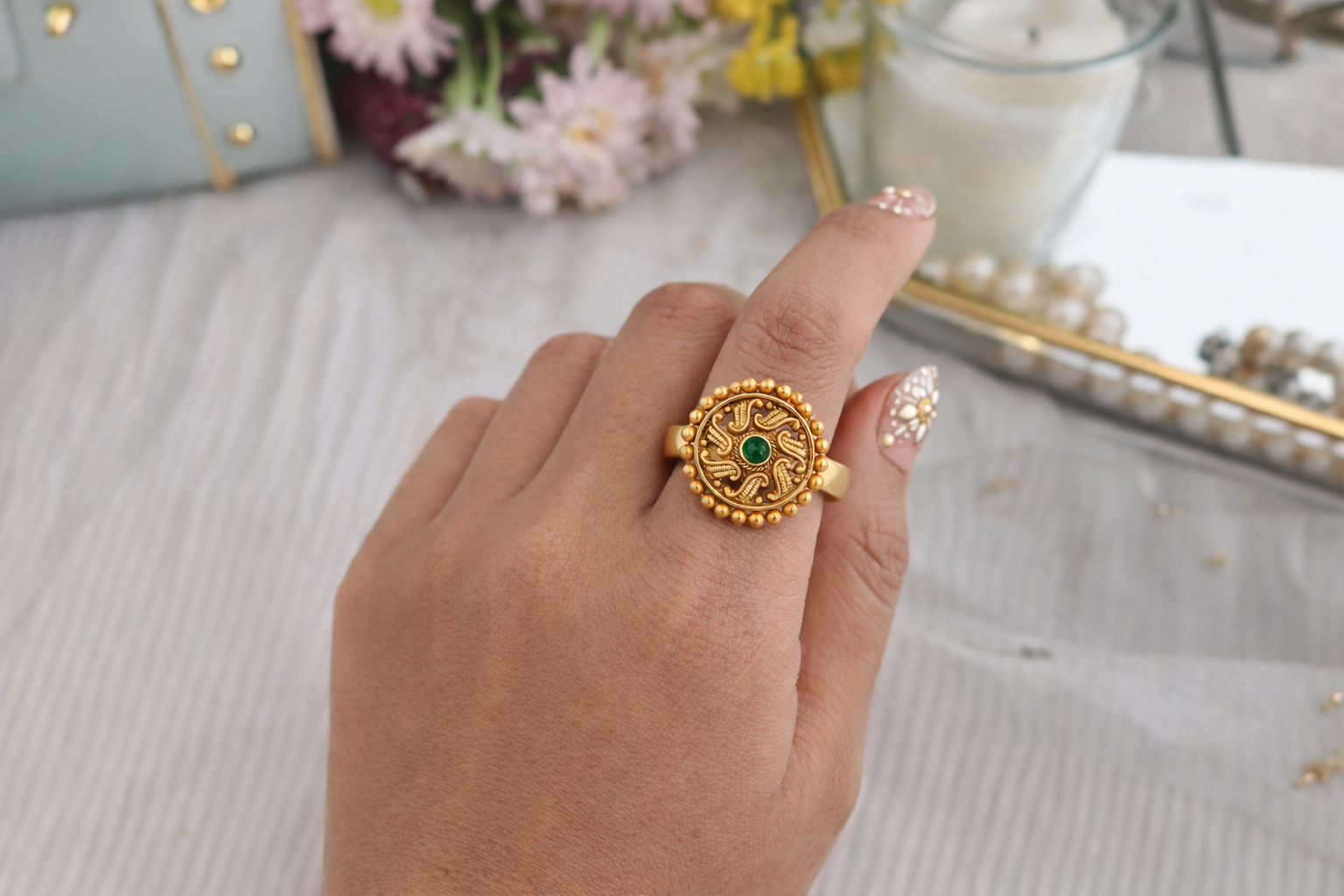 The Devbhoomi SwarnChakra HaritPrabha Ring reflects the brilliance of the Himalayan sun rising over emerald valleys. Designed in a circular chakra pattern, flowing motifs radiate outward in harmonious symmetry. At its center rests a vibrant green stone, symbolizing growth, balance, and the sacred forests of Uttarakhand. The rich gold plating enhances its festive glow while preserving intricate handcrafted details. A bold yet elegant statement piece rooted in mountain tradition.