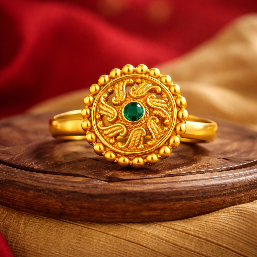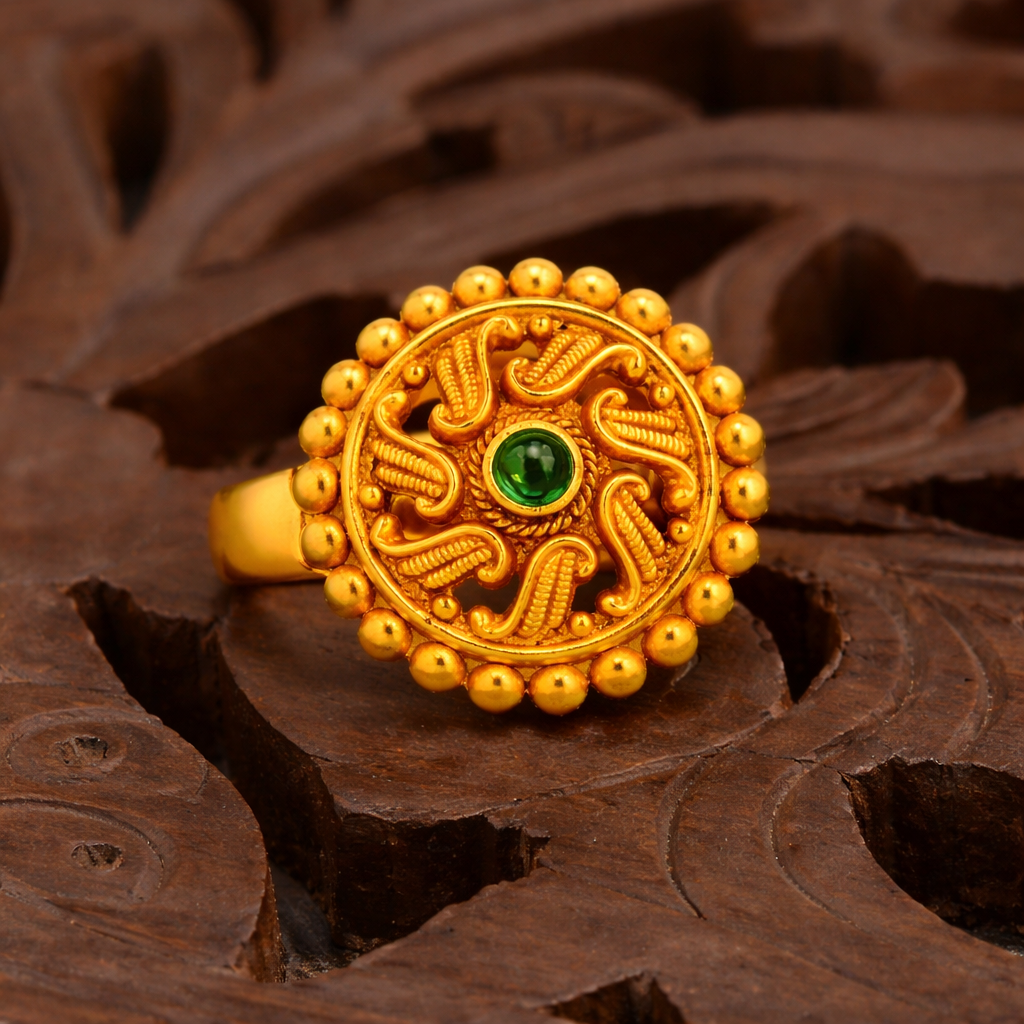The circular chakra design represents cosmic energy and the eternal cycle of life in Himalayan belief. Gold tones symbolize prosperity, warmth, and the sacred sun worshipped in mountain culture. The green stone reflects Uttarakhand’s dense forests and life-giving rivers. Such radiant patterns are reminiscent of temple carvings and ceremonial adornments worn during festivals. This ring embodies harmony, strength, and the spiritual vibrance of Devbhoomi.