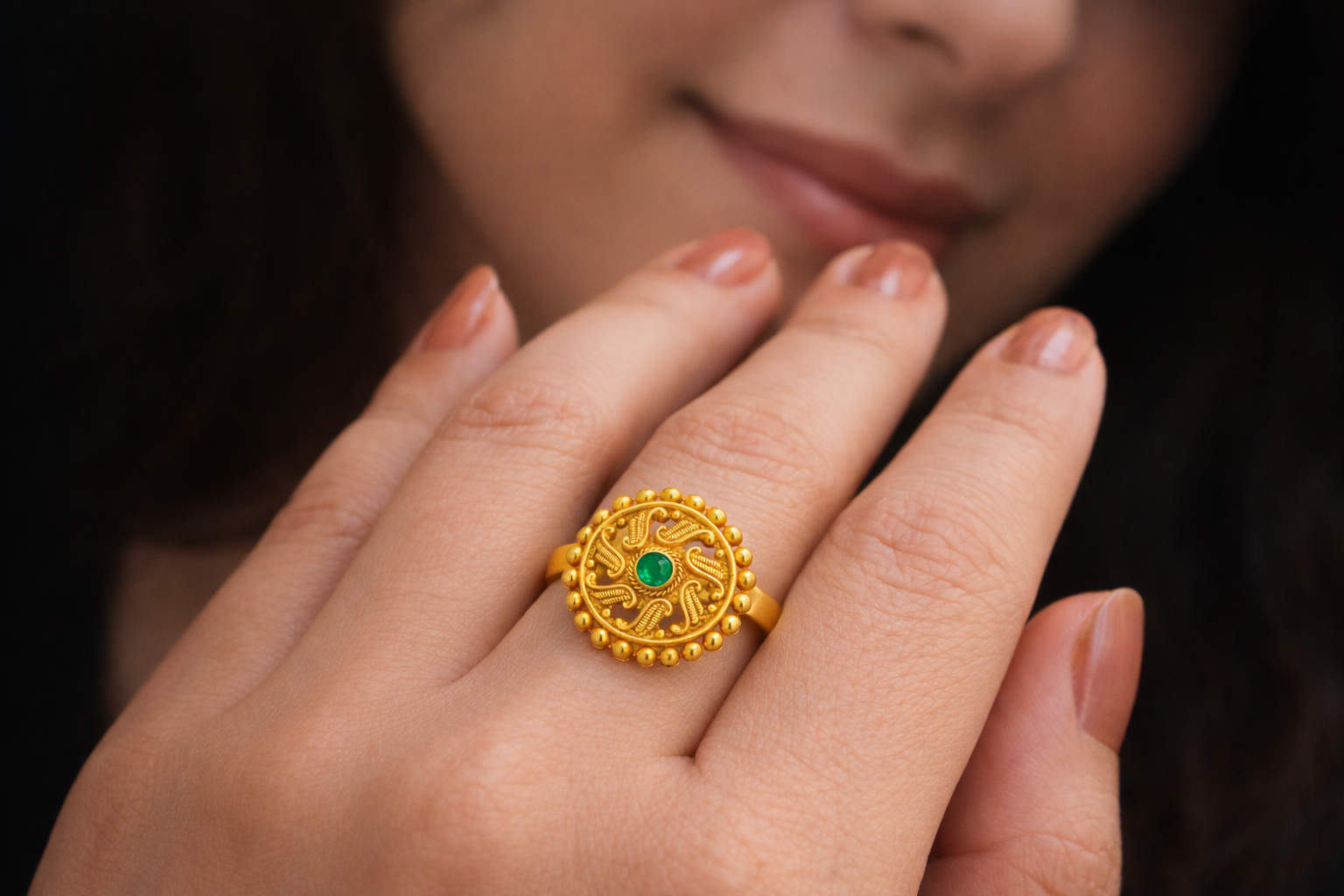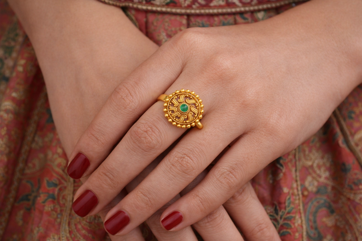 A radiant gold-plated silver chakra ring inspired by the sacred sun and lush valleys of Uttarakhand.