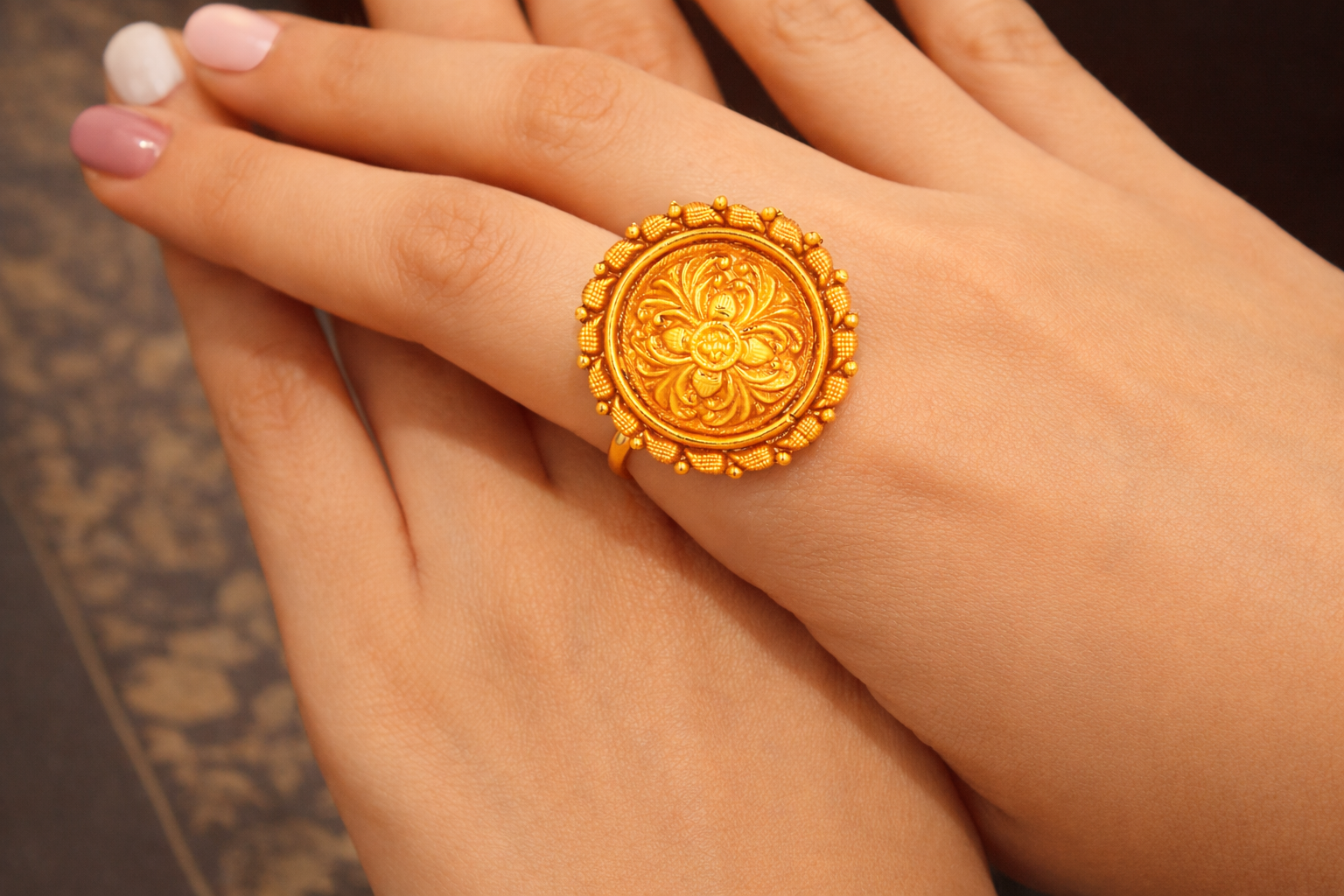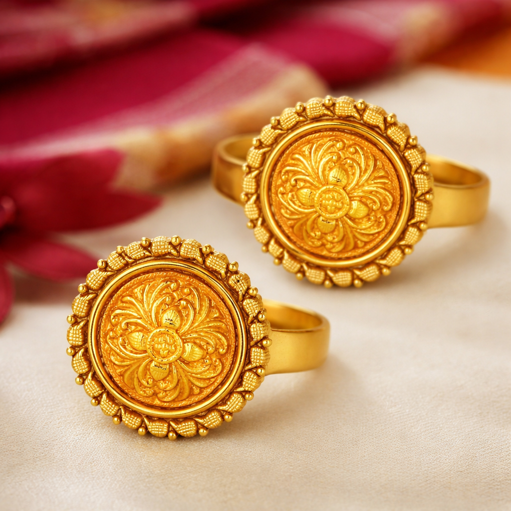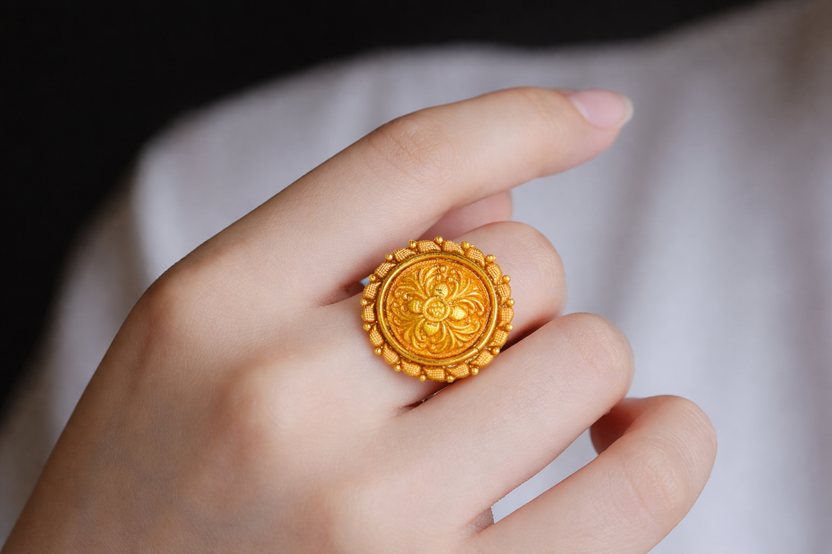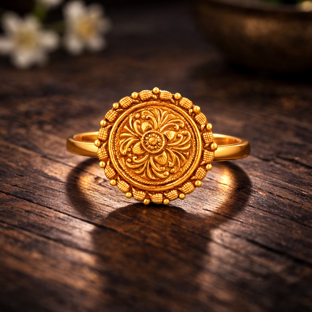 Floral motifs hold deep meaning in Uttarakhand, symbolizing purity, prosperity, and divine blessings. The circular design represents the eternal cycle of life and spiritual balance in Himalayan belief. Gold tones reflect abundance and the sacred sunlight that graces Devbhoomi’s peaks. Such ornate patterns resemble traditional ceremonial ornaments worn during festivals and rituals. This ring embodies devotion, grace, and the timeless beauty of mountain culture.