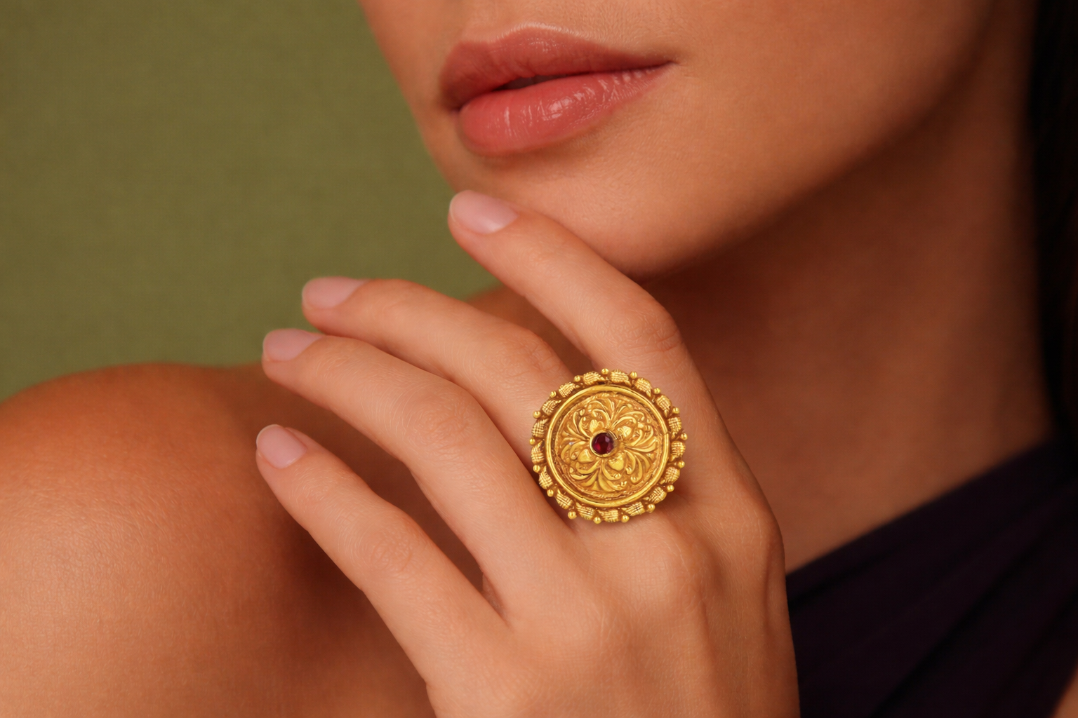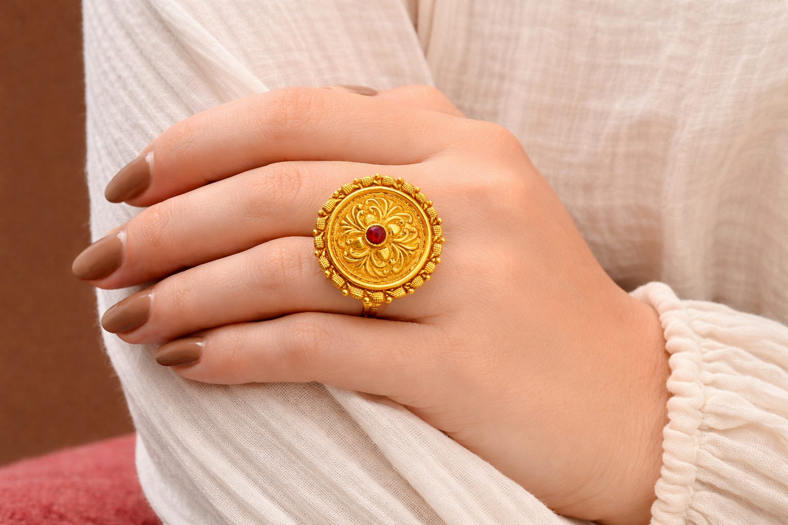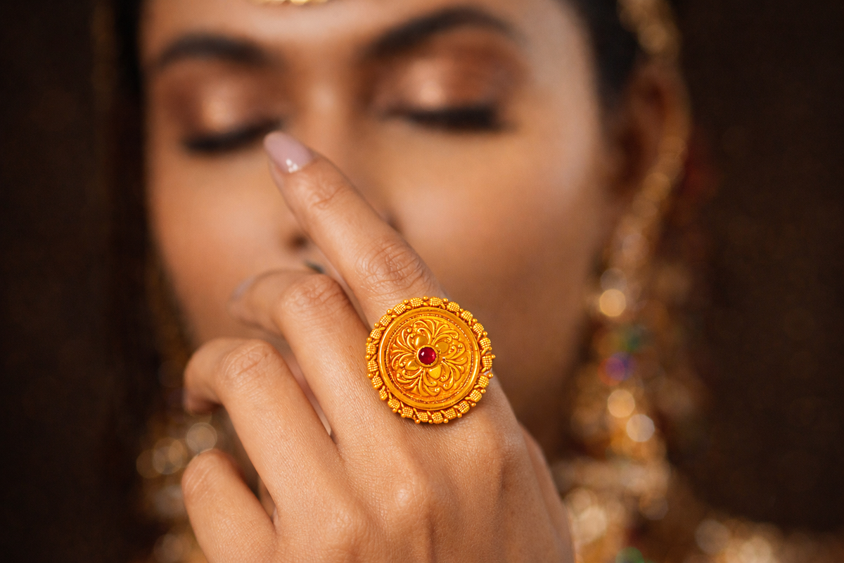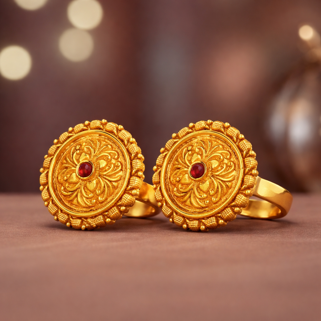 Floral mandalas hold deep spiritual meaning in Himalayan culture, representing balance, beauty, and divine connection. The golden hue reflects prosperity and the sacred sunlight that blesses Devbhoomi. The crimson stone symbolizes Shakti — the powerful feminine energy worshipped across Uttarakhand. Circular patterns echo traditional ceremonial ornaments worn during festivals and sacred rituals. This ring embodies devotion, abundance, and the vibrant spirit of the mountains.