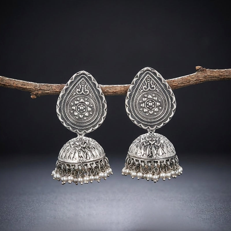 A handmade silver jhumki that draws inspiration from the elaborate temple designs and ceremonial jewelry found in the hills of Uttarakhand.