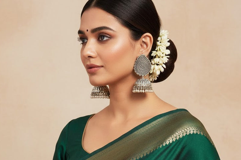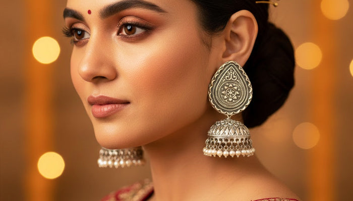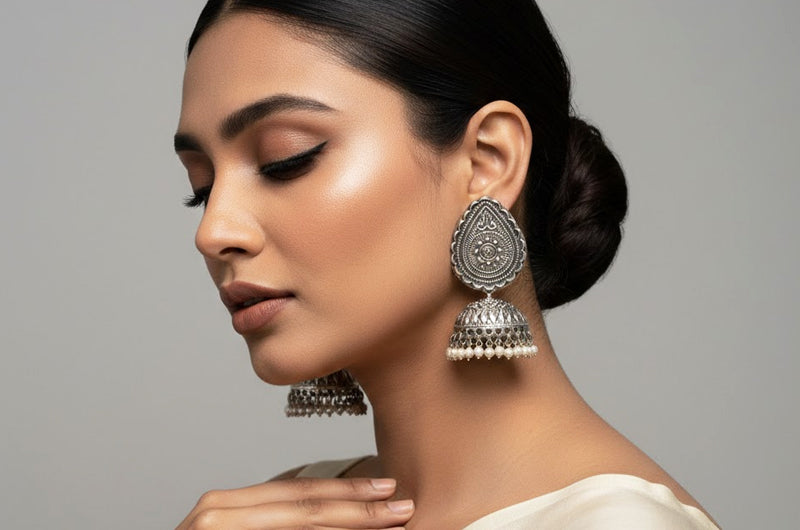 Rooted in the sacred visual language of Uttarakhand’s hill temples, the Devshringi Silver Jhumki reflects motifs associated with protection, prosperity, and divine balance. The domed silhouette echoes temple shikhar forms and ceremonial adornments worn during Garhwali and Kumaoni rituals, making the piece feel spiritually grounded and culturally resonant. It carries the quiet grandeur of Devbhoomi traditions, designed to complement festivals, weddings, and meaningful cultural gatherings.
