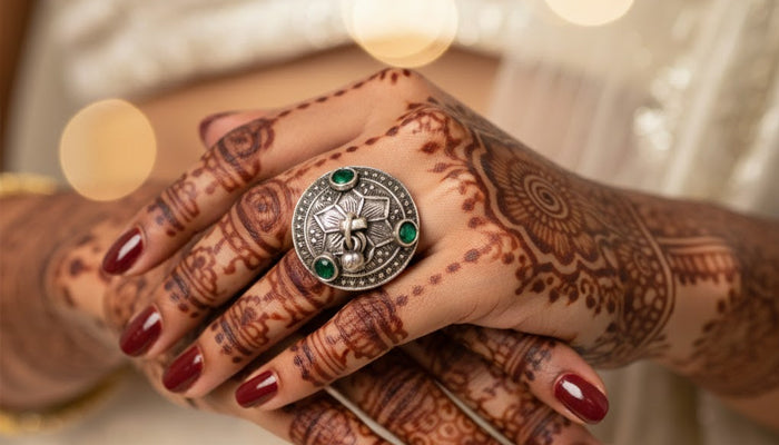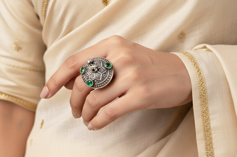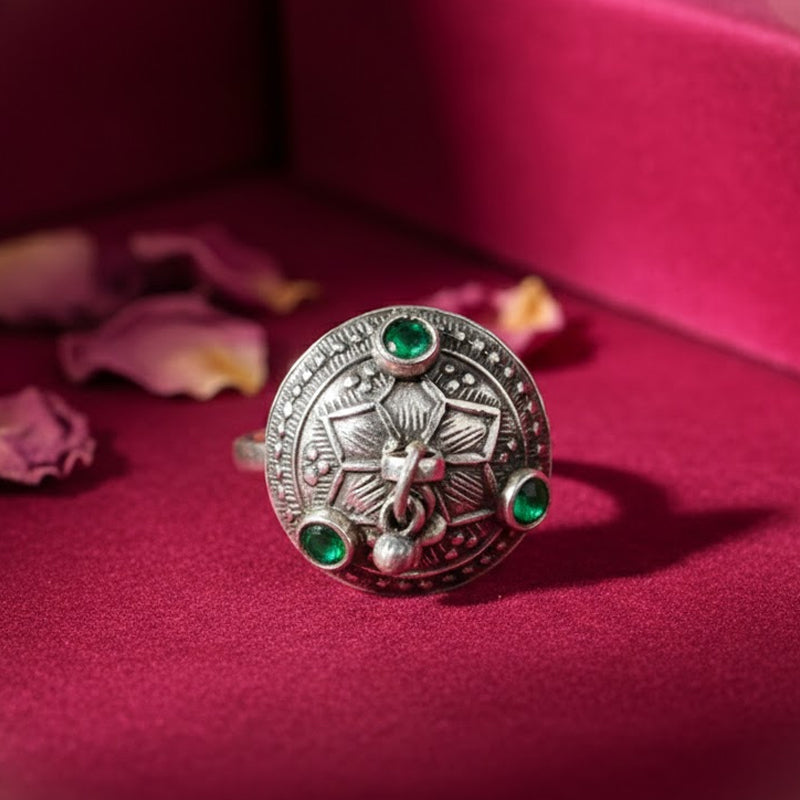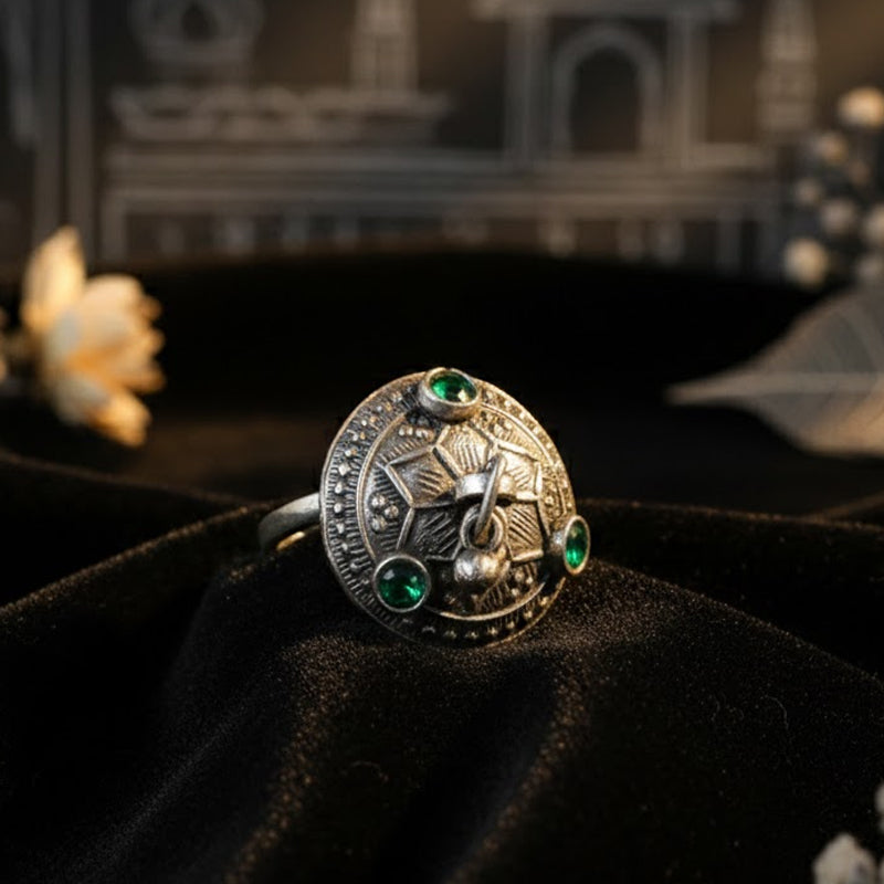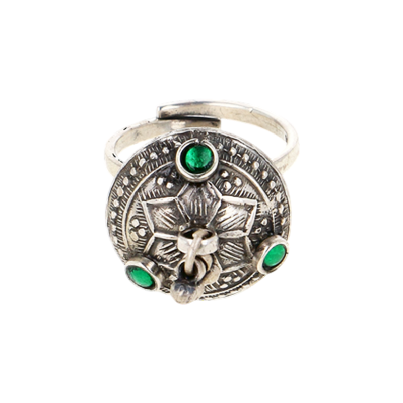 The design of this ring is based on the idea of hari-bind, in which green is connected to steadfastness, growth, and freshness in hill culture. The green stones on the surface serve as points of visual equilibrium, and the round silver face produces a confined form. In order to keep jewelry dynamic rather than static, Uttarakhand rings frequently feature a little hanging silver piece in the middle. These rings were prized for their subtle symbolism and earthy feel, and they were worn every day. It is useful for extended periods of wear due to its sturdy design and adjustable silver band.