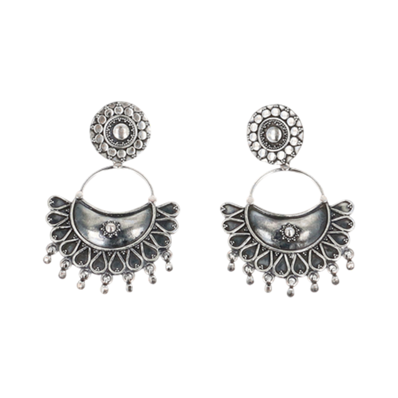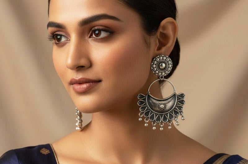 This jhumki showcases meticulous Pahadi silver craftsmanship. The tiered petals are carefully hand-formed to achieve a “bloom within a bloom” effect, while the sun-etched disk adds texture and symbolic significance. The contrast between smooth silver petals and oxidised backgrounds highlights depth and detail. Finished in 925 sterling silver, the set honours generations of artisans who blend precision, symbolism, and natural inspiration into enduring wearable art.