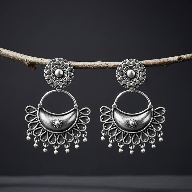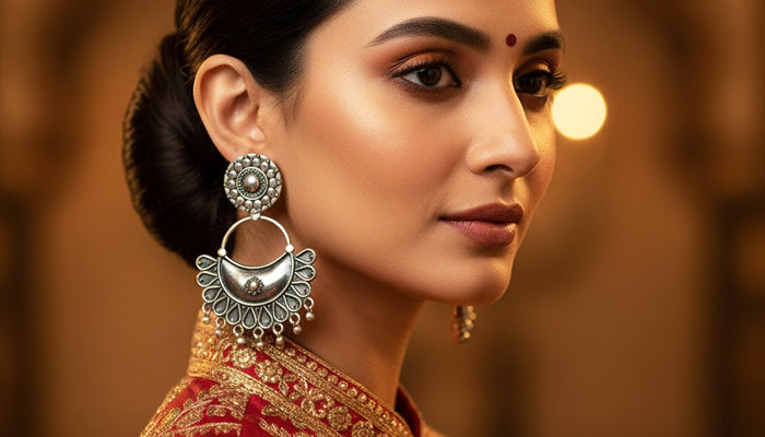 Named after the 'Him-Jyoti' (everlasting snow-light), this set features a wonderful tiered bloom look. A flowery stud holds a big circular disk etched with a sunburst border. A secondary, hand-applied silver flower lies in the center, producing a "bloom within a bloom" that embodies mountain flora. The contrast between the smooth silver petals and the darkish, textured background makes it an elegant option for a Pahadi bride.