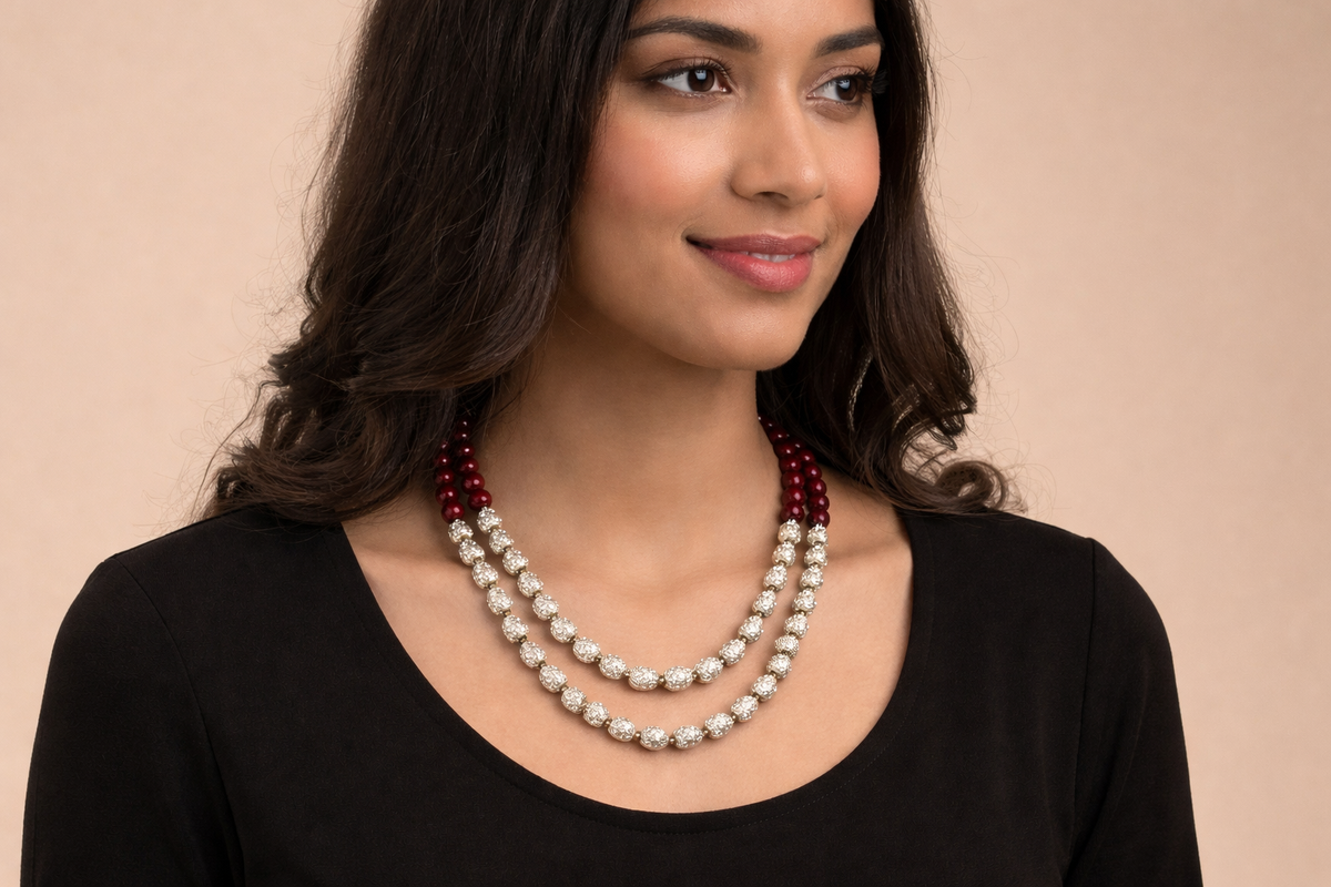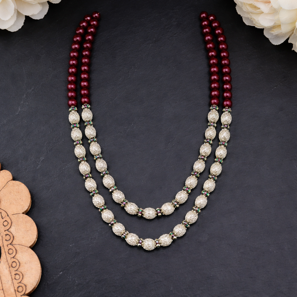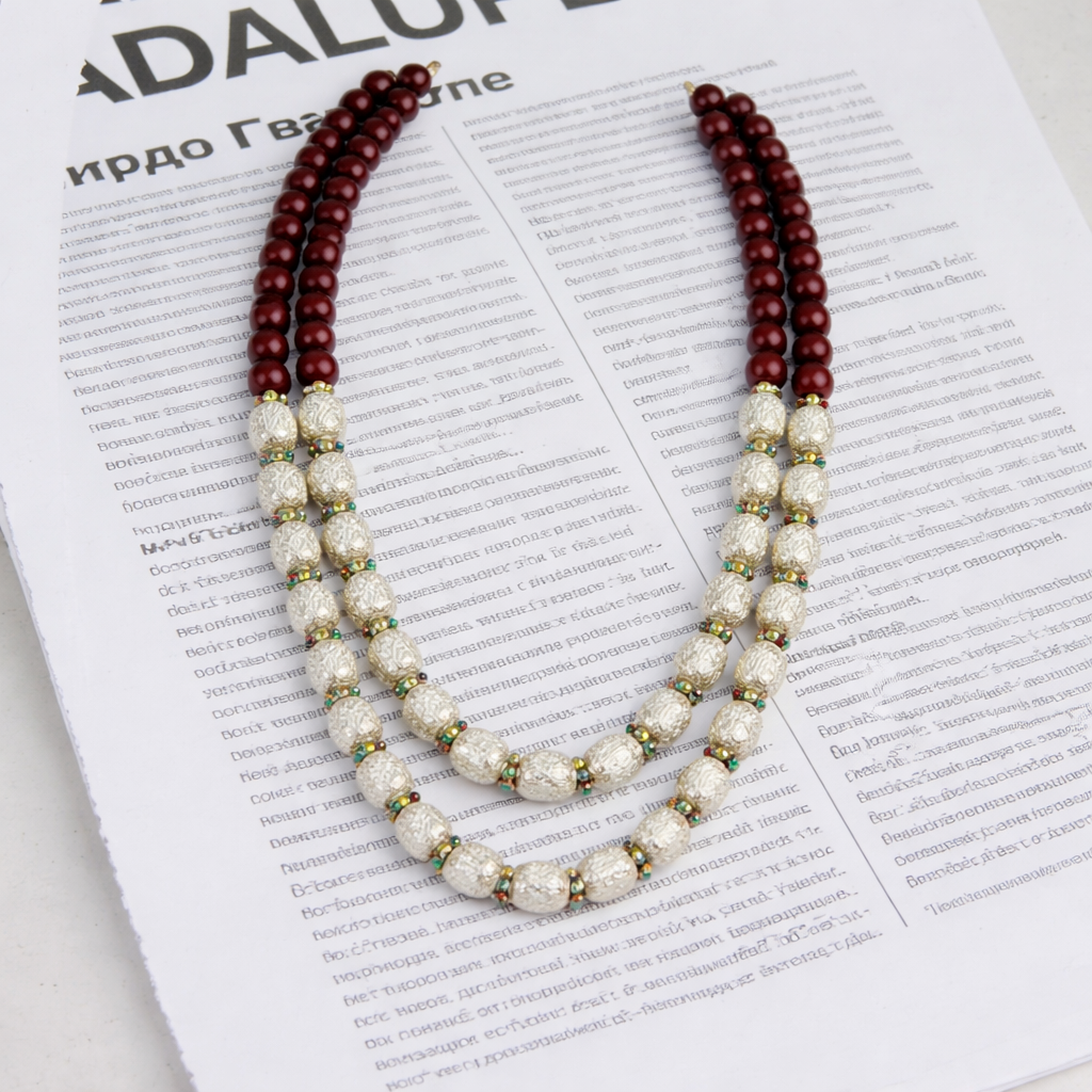 The Himalayan Royal Silver Bead Necklace is a refined celebration of mountain heritage and classic design. Featuring rich maroon beads paired with intricately textured silver-toned oval accents, this double-strand piece creates a graceful layered silhouette. Subtle green highlights between the beads add depth and traditional charm. Designed to sit elegantly along the neckline, it offers both sophistication and cultural authenticity. Perfect for festive gatherings, weddings, and traditional occasions, it embodies understated royalty.