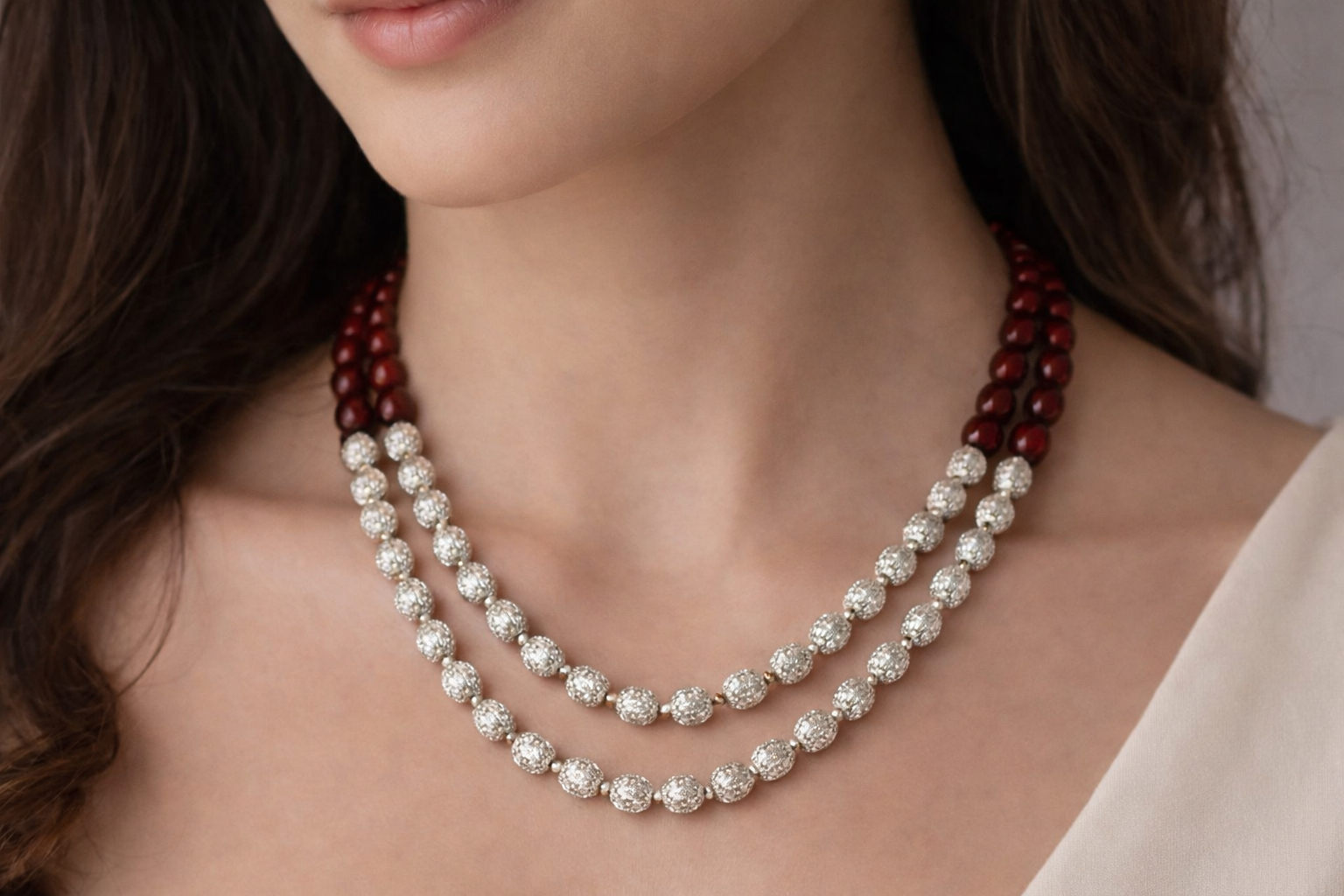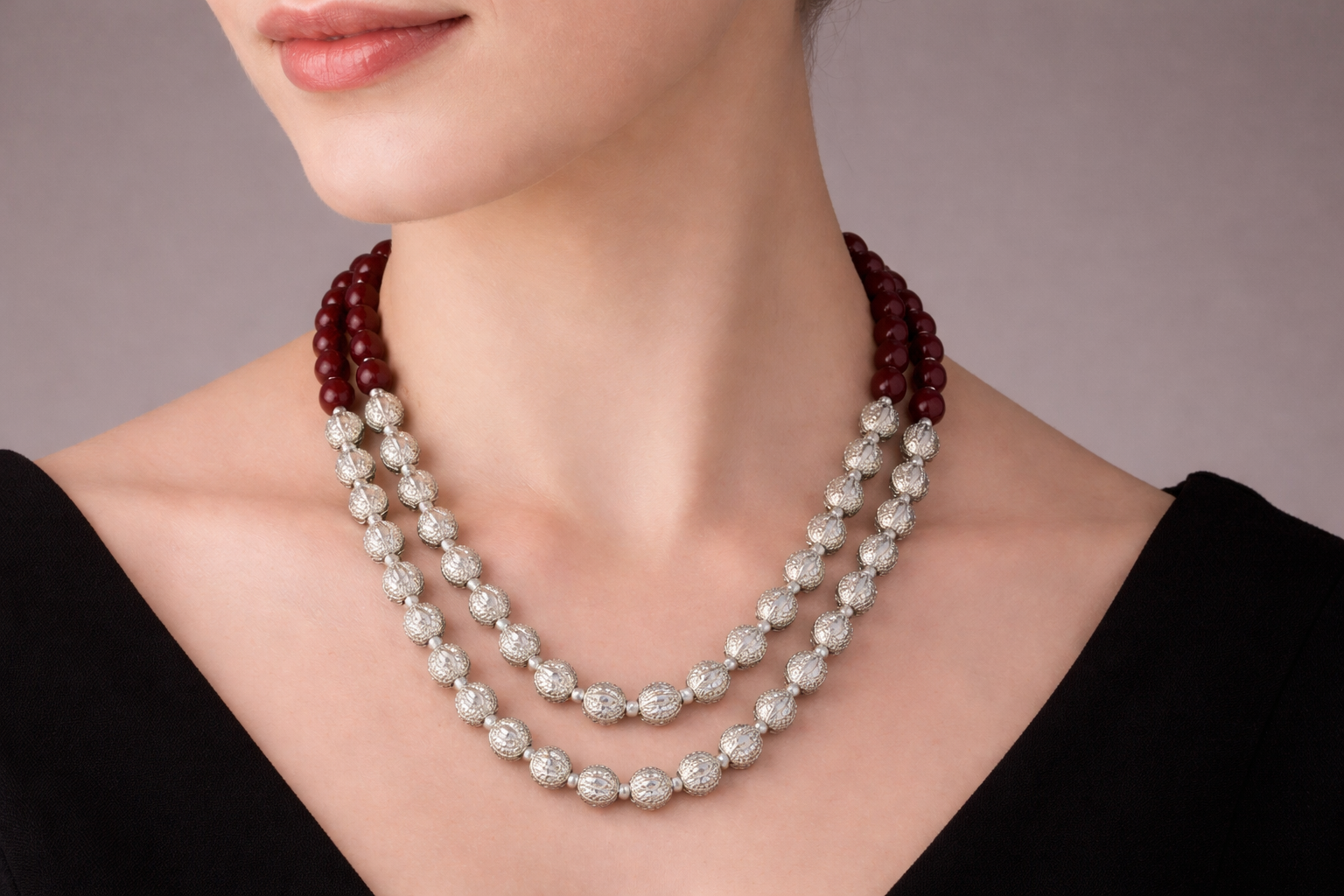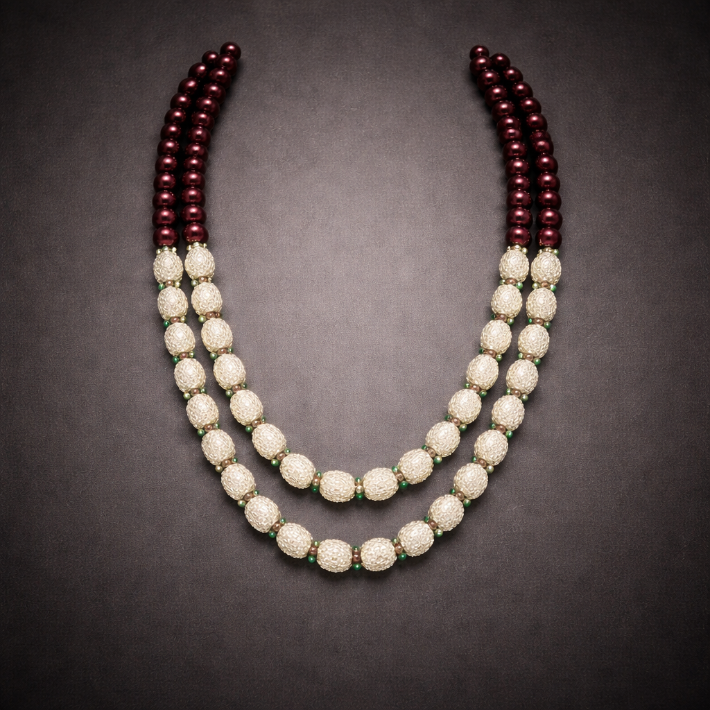 The Himalayan Royal Silver Bead Necklace is a refined celebration of mountain heritage and classic design. Featuring rich maroon beads paired with intricately textured silver-toned oval accents, this double-strand piece creates a graceful layered silhouette. Subtle green highlights between the beads add depth and traditional charm. Designed to sit elegantly along the neckline, it offers both sophistication and cultural authenticity. Perfect for festive gatherings, weddings, and traditional occasions, it embodies understated royalty.