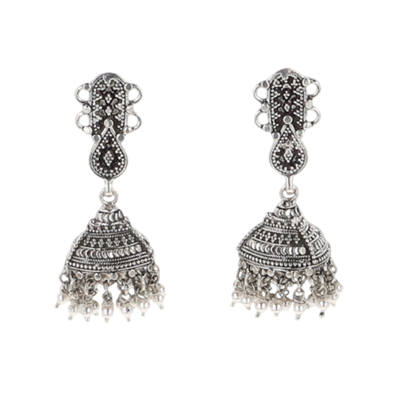 This silver jhumki has layered engraving and a traditional dome silhouette, drawing inspiration from the ghantikas found in Uttarakhand temples. With each stride, the hanging silver beads provide a faint melodic movement. It is made entirely by hand out of silver and combines wearing elegance with ritual symbolism. Ideal for heritage collections and cultural events.