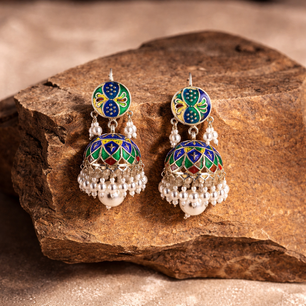 The Himjyoti Rangoli Jhumki captures the lively spirit of Garhwal and Kumaon through its rich blue and green enamel artistry. The dome-shaped silhouette is adorned with intricate geometric and floral motifs reminiscent of traditional Himalayan rangoli patterns. Layers of delicate pearl clusters create graceful movement, adding elegance to every step. The silver-toned framework enhances the vibrancy of the colors while maintaining a timeless appeal. Perfect for festive occasions, traditional ceremonies, and Pahadi-inspired styling.