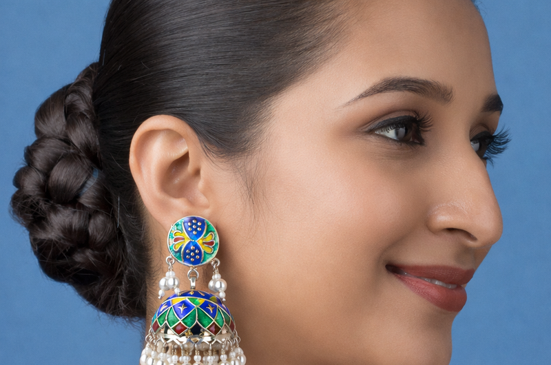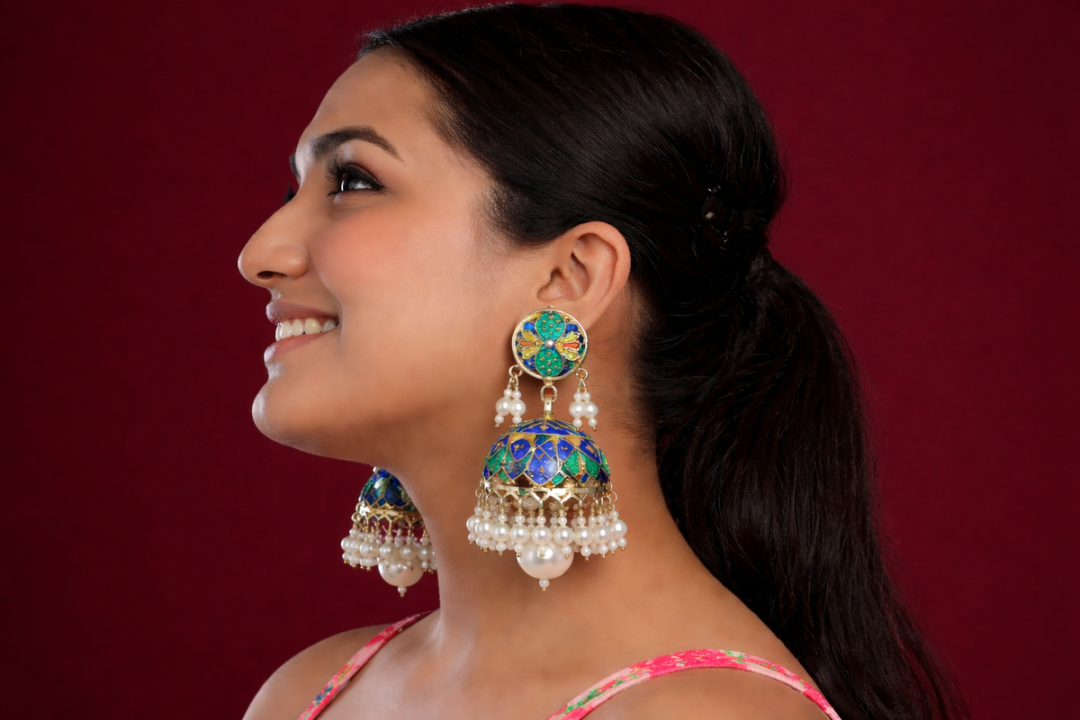 Inspired by Uttarakhand’s rich cultural heritage, this design reflects the vibrant hues seen in local attire and festive decorations. The blue symbolizes the serene Himalayan skies, while green echoes the lush valleys of the region. Pearl embellishments represent purity and grace, often associated with traditional celebrations. Jhumkis have long complemented Pahadi jewelry traditions during weddings and folk festivals. This piece carries the soulful charm of mountain culture in a contemporary form.