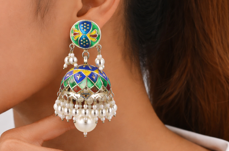 A vibrant meenakari jhumki with cascading pearls, inspired by the colorful traditions of Uttarakhand.