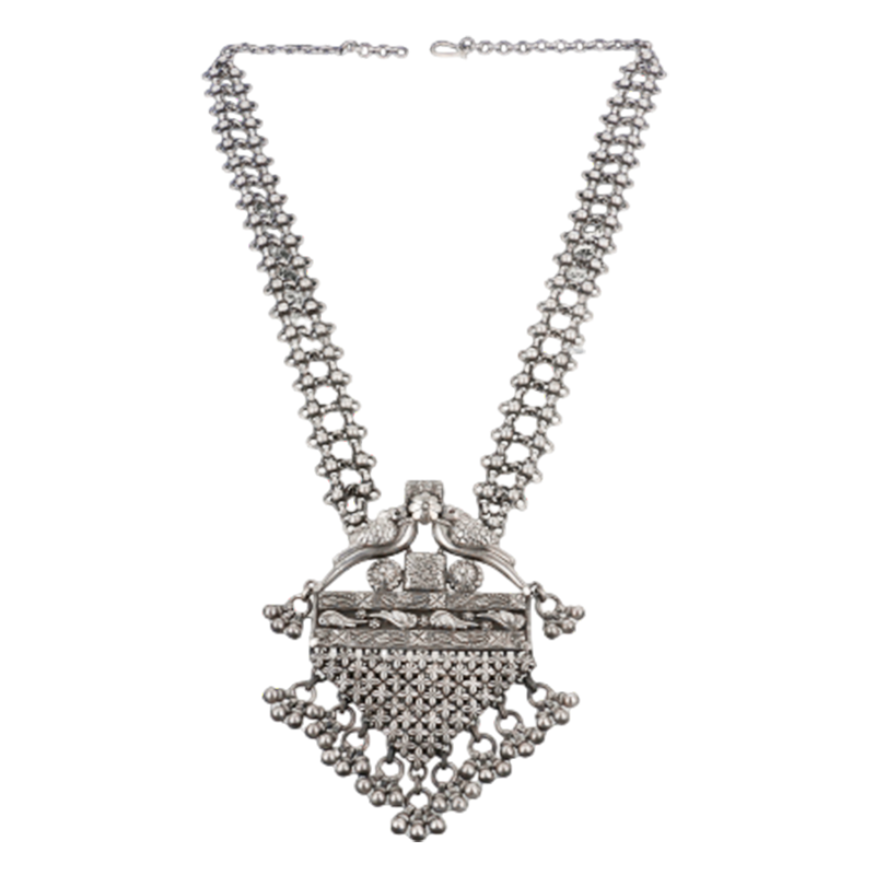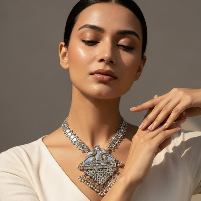 Handcrafted by Himalayan artisans, this necklace demonstrates advanced sculpting and finishing techniques. Each textured layer and hanging detail is shaped with care, preserving temple-inspired silversmithing traditions while presenting a timeless statement rooted in Uttarakhand’s rich craft heritage.