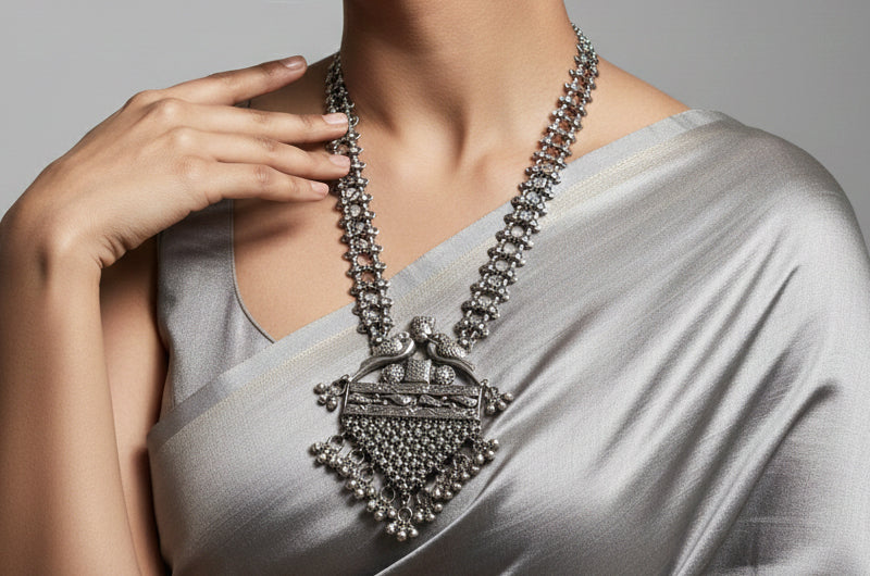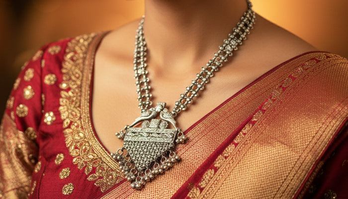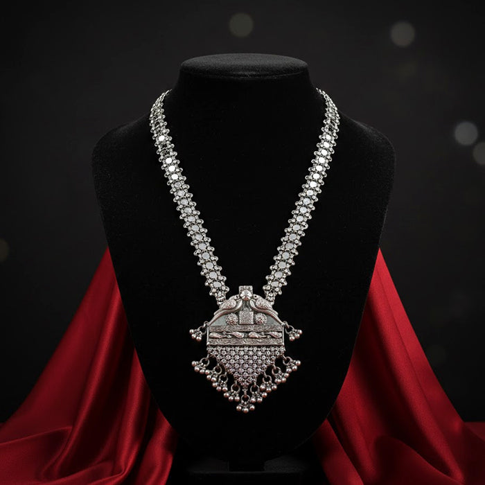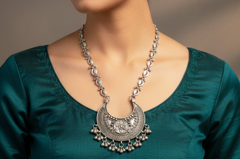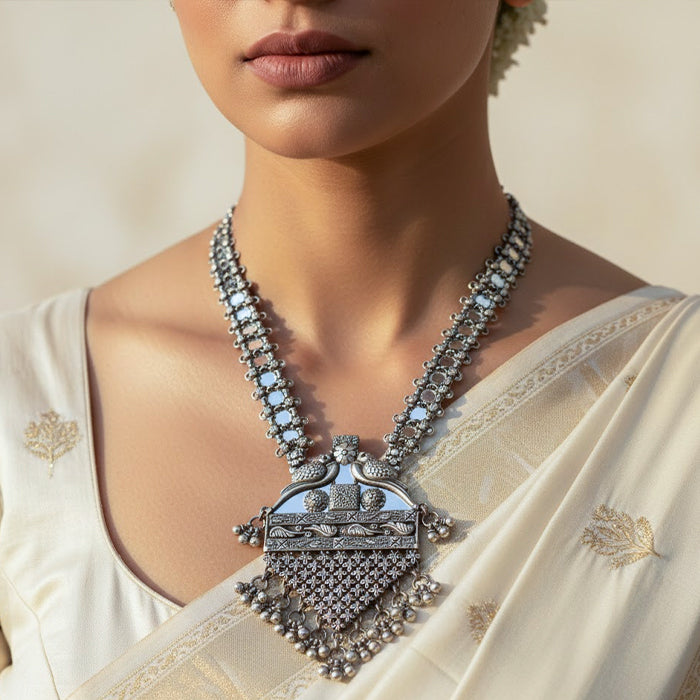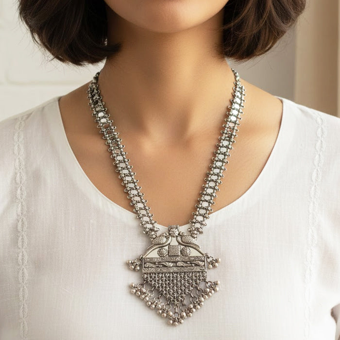 This handcrafted silver necklace showcases a bold pendant with intricate surface detailing and balanced symmetry. The structured chain adds strength, while the gentle hanging elements bring movement—making it a powerful yet graceful piece for festive and traditional styling.