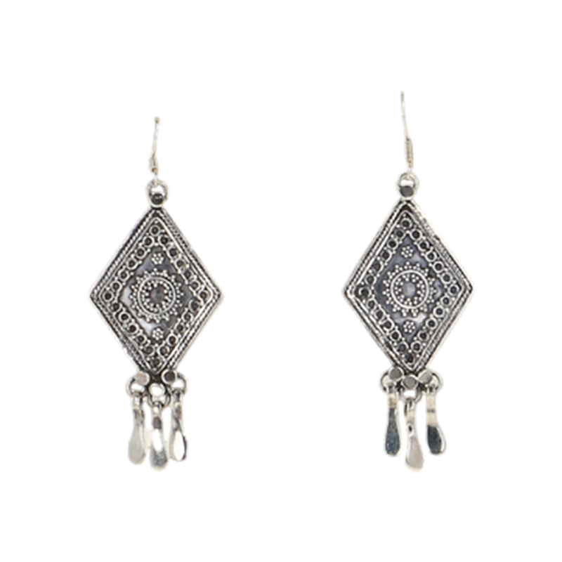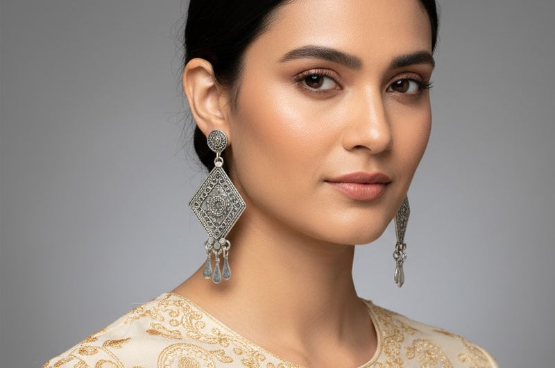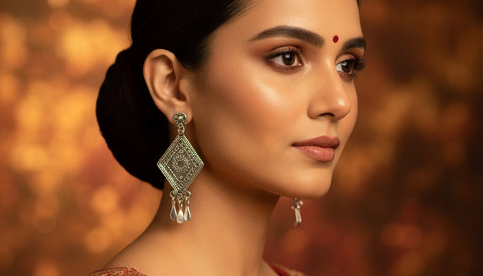 This jhumki showcases meticulous Pahadi craftsmanship. The hexagonal pendant is hand-etched with intricate floral tendrils, while earth-toned beads are carefully selected for natural texture and harmony. The large silver spheres provide balance, weight, and traditional rhythm, enhancing the tactile and visual appeal. Finished in 925 sterling silver, the piece reflects generations of artisans who transform protective symbolism, regional motifs, and precise metalwork into enduring wearable art.