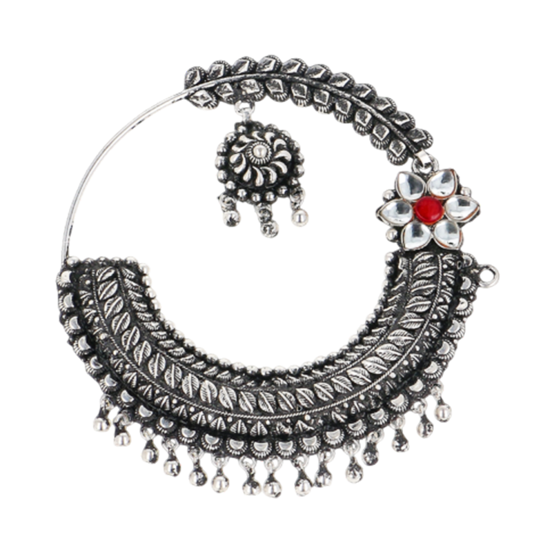 This silver nath is inspired by the floral offerings and ceremonial ornaments found at Uttarakhand's hill temples and weddings. The flower motif with colorful stone depicts sacred blooms utilized in rites, while the leaf-patterned arc represents prosperity and continuity. The broad crescent body resembles traditional Kumaoni bridal nath designs. Hanging silver drops provide rhythmic movement and reflect celebratory noises throughout celebrations. This nath, made entirely of silver, is excellent for wedding and cultural wear.