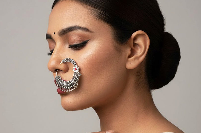 A handcrafted silver nath inspired by floral temple adornments and Uttarakhand wedding traditions.