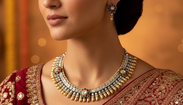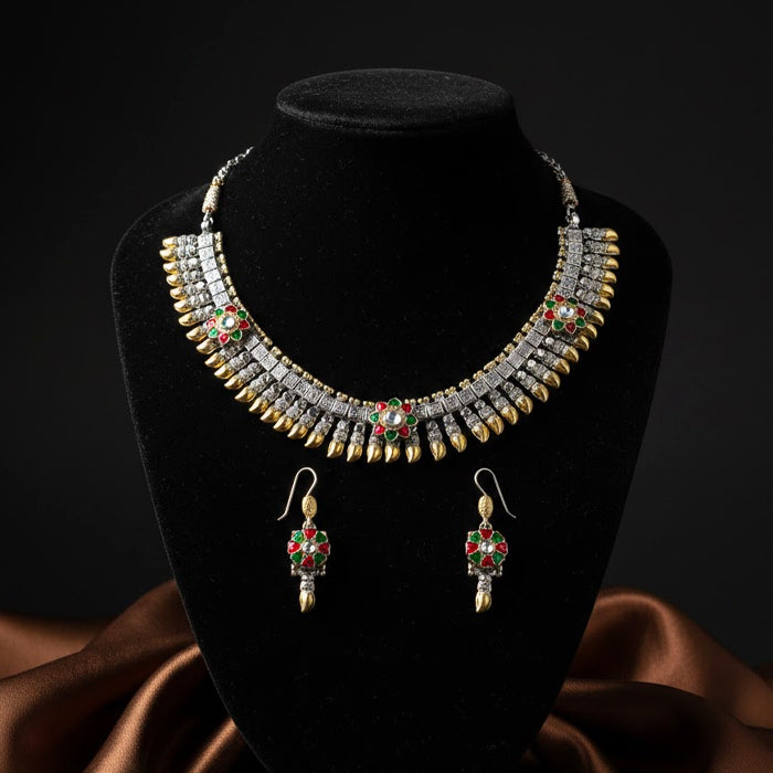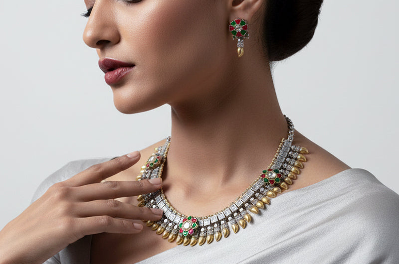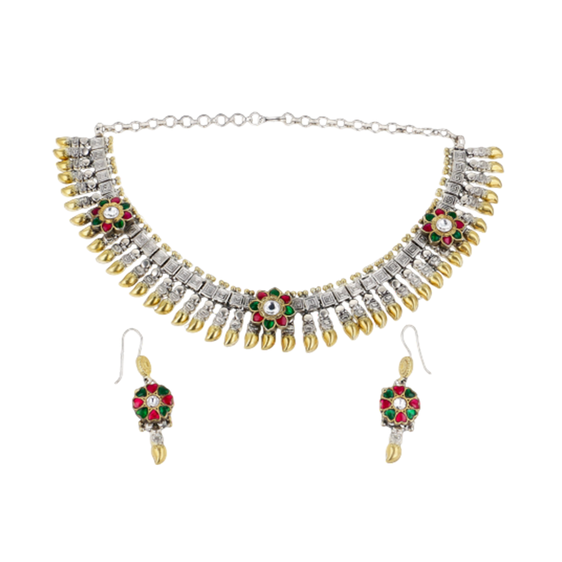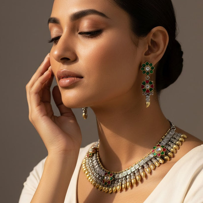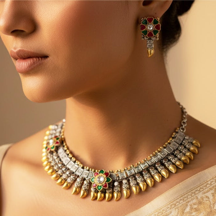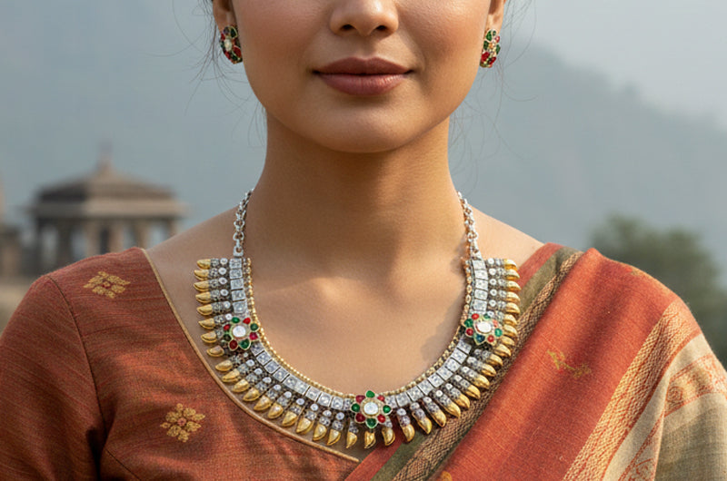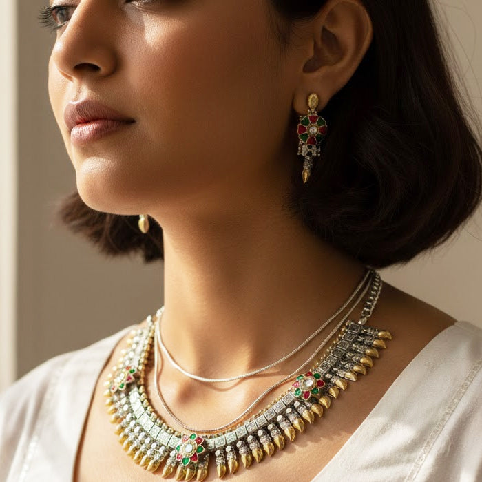 This jewellery set reflects the artistry of Uttarakhand’s hills, where Garhwali silver craft meets Kumaoni gemstone tradition. The alternating gold and silver tones echo temple bells and mountain light, while the red and green floral motifs mirror the blossoms of the Himalayan valleys. Each detail is a tribute to the region’s artisans, who weave devotion and nature into ornaments that embody both heritage and celebration.