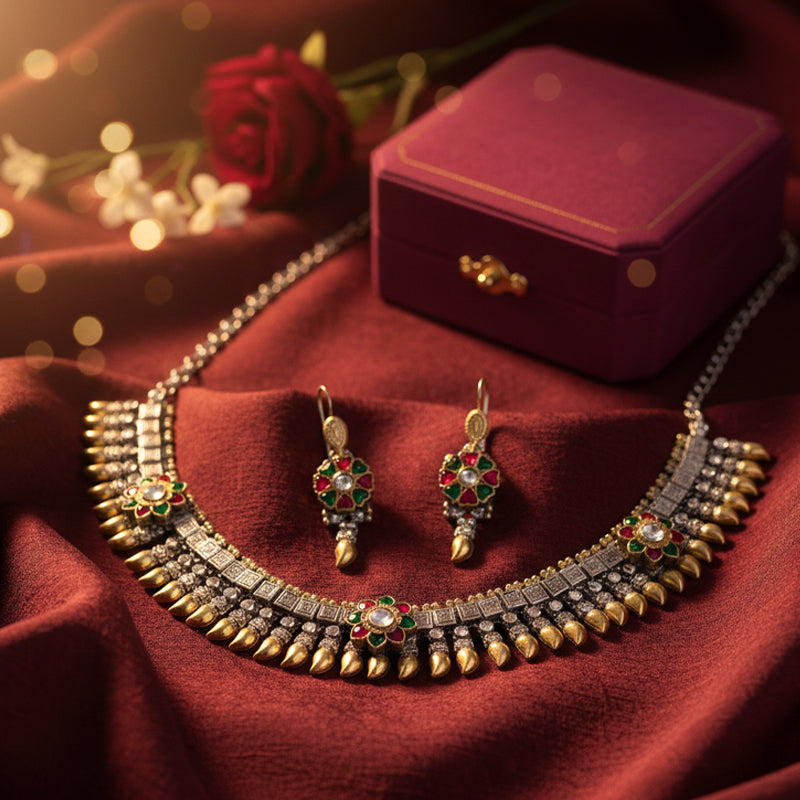 Crafted by skilled Uttarakhand artisans, this necklace set blends Garhwali silverwork with Kumaoni gemstone traditions. Each motif is carefully formed and finished by hand, preserving regional techniques that transform devotional symbolism and natural beauty into heirloom jewellery rooted in Himalayan heritage.