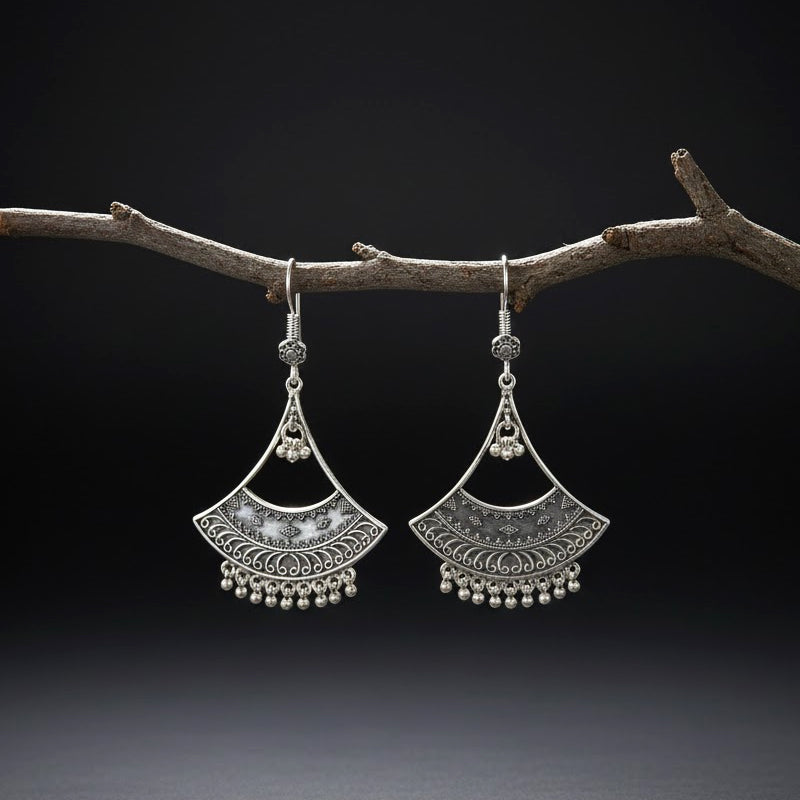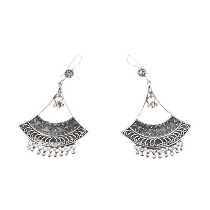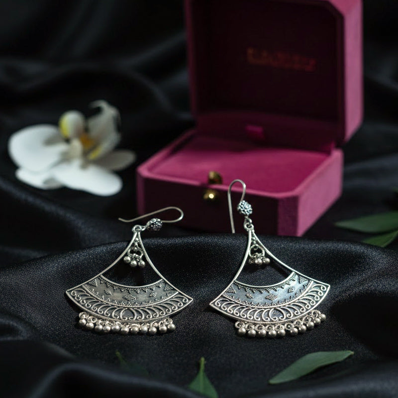 This jhumki exemplifies meticulous Pahadi silver craftsmanship. The diamond-shaped stud is etched with precise lattice patterns, while the circular medallion is decorated with polished granules to create texture and depth. The hanging bell with silver droplets introduces gentle rhythm and movement, enhancing both sound and visual appeal. Finished in 925 sterling silver, the piece reflects generations of artisans who merge architectural motifs, detailed metalwork, and wearable elegance into enduring mountain heritage.