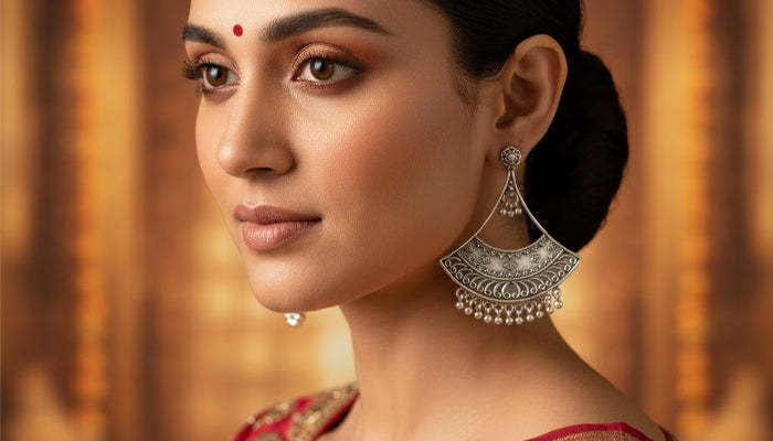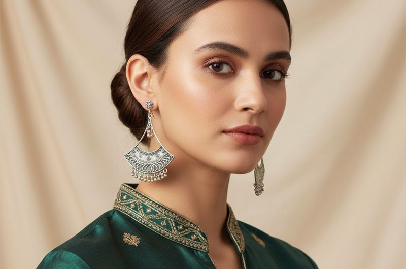 The Kholi-Dar Jhumka Jhumki takes inspiration from the Kholi, the intricately carved main entrance of traditional hill homes, symbolising protection, welcome, and architectural heritage. The geometric patterns and concentric silver motifs mirror the detailed woodwork of Kumaoni homes, connecting ancestral artistry to contemporary adornment. The jhumka embodies the balance between tradition, aesthetics, and ceremonial significance in Devbhoomi culture.
