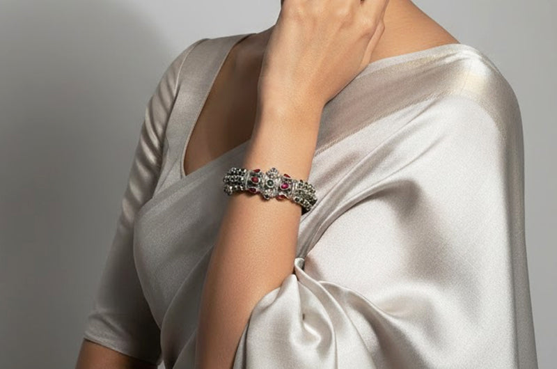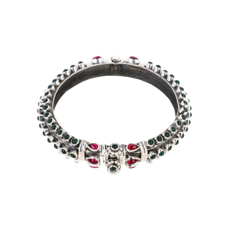 Reflecting the ornamental traditions of Uttarakhand, this bangle symbolizes strength, continuity, and festivity. Circular stone motifs echo the recurring patterns found in ceremonial adornments, while the robust silver construction connects wearers to enduring hill craft aesthetics and cultural heritage.
