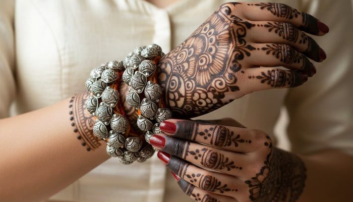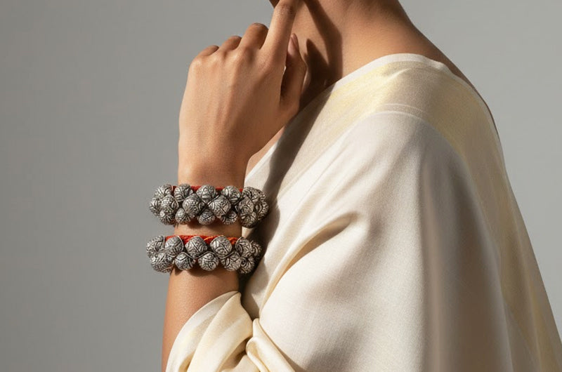 Silver jewellery should be worn after applying makeup, perfume, or lotions to avoid chemical contact. Keep it away from water, sweat, and harsh substances, and remove it before bathing, exercising, or sleeping. When not in use, store the jewellery in a dry, airtight pouch to prevent tarnishing. Clean gently with a soft, dry cloth after wear. Natural tarnishing may occur over time and can be easily restored with proper polishing.