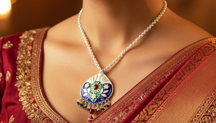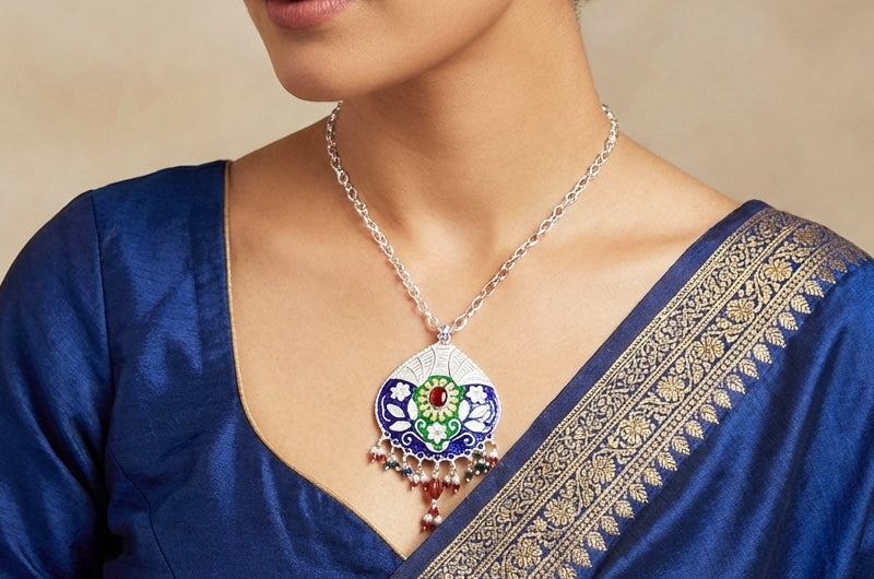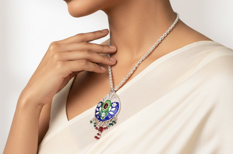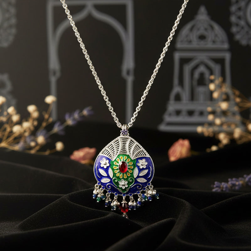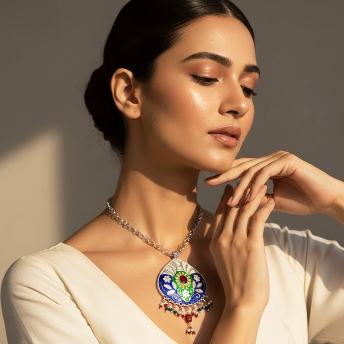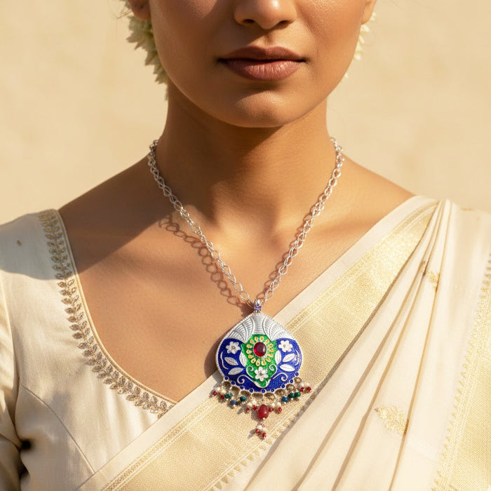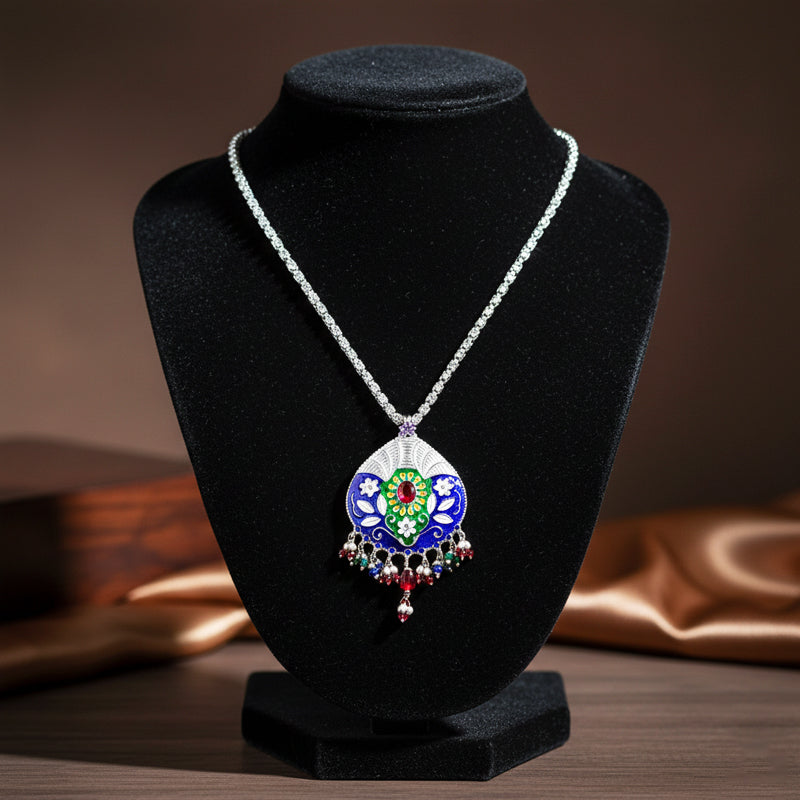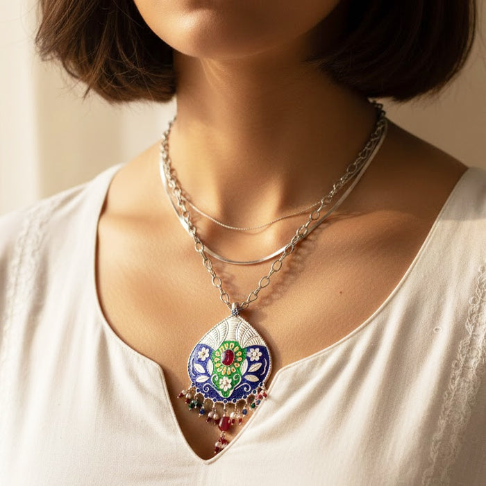 Handcrafted by skilled artisans, this necklace combines enamel work, detailed silver carving, and bead attachment techniques. Each pendant and bead is meticulously shaped, preserving generational silversmithing practices while transforming regional motifs and festive colors into a wearable expression of Himalayan craftsmanship.