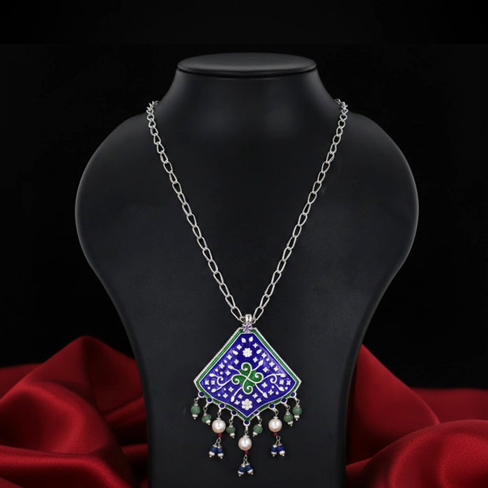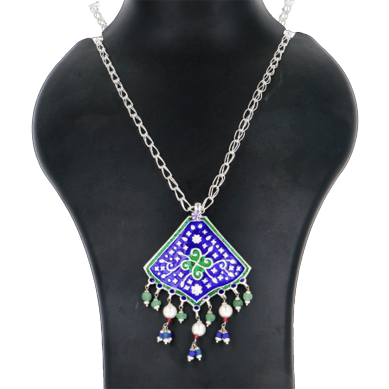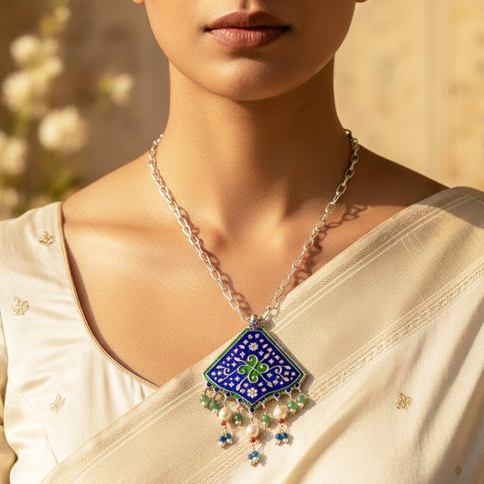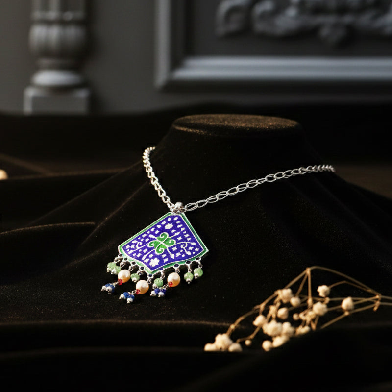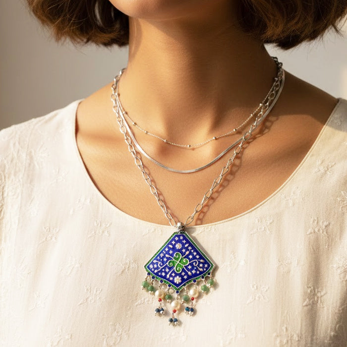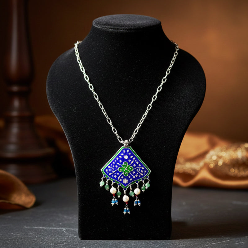A diamond-shaped silver pendant necklace featuring blue enamel patterns and soft bead drops for a graceful finish.