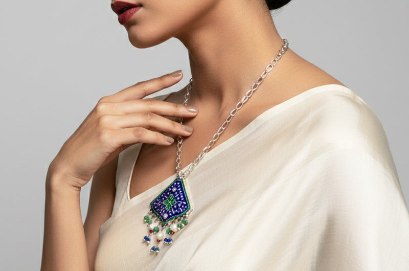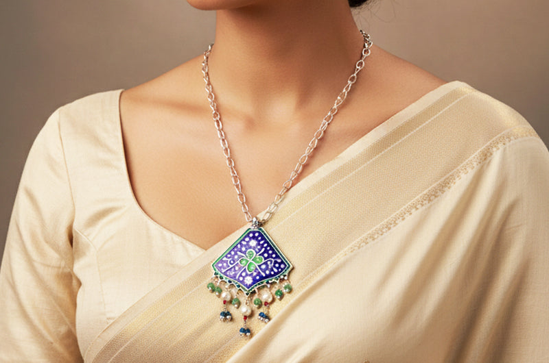Inspired by Uttarakhand’s hill artistry, this necklace symbolizes harmony, celebration, and elegance. The geometric pendant reflects order and balance, while blue enamel and floral motifs echo regional nature and ceremonial adornments, making it a refined piece for festive and traditional wear.