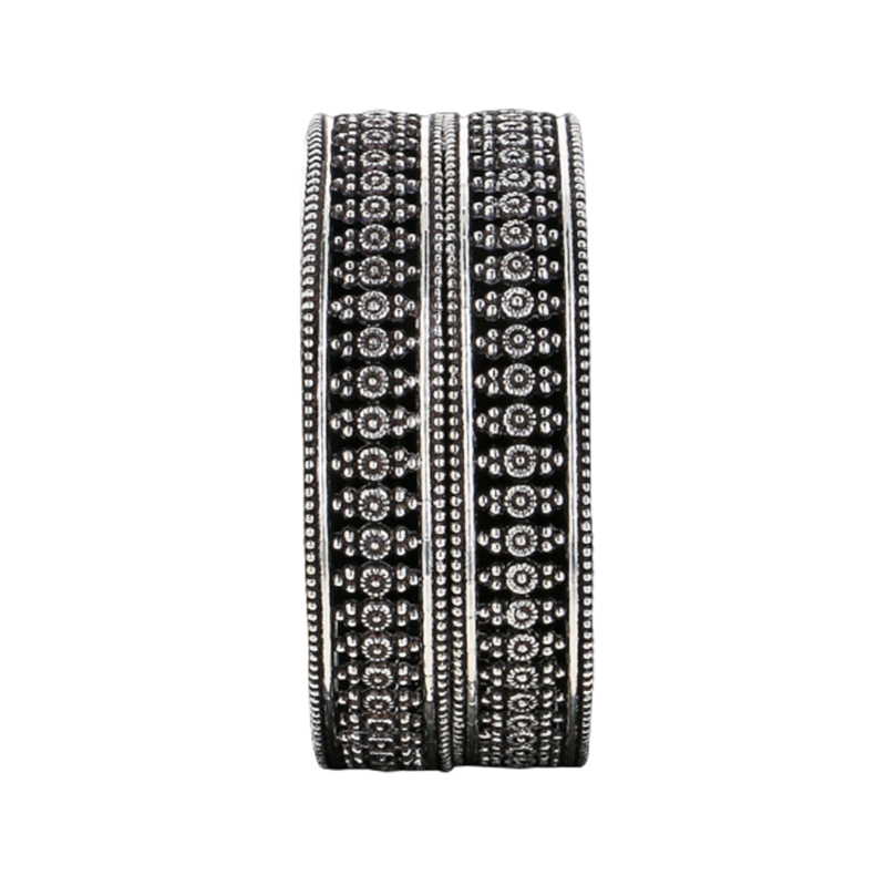 The carefully packed and woven wool used in Uttarakhand's cold-region crafts is reflected in the tightly organized details of these bangles. The round shape maintains the design balanced and wearable, while the surface feels dense and protective. Maintaining durability and structure is aided by subtle borders. The silver bangles fit both festive and daily ethnic attire.