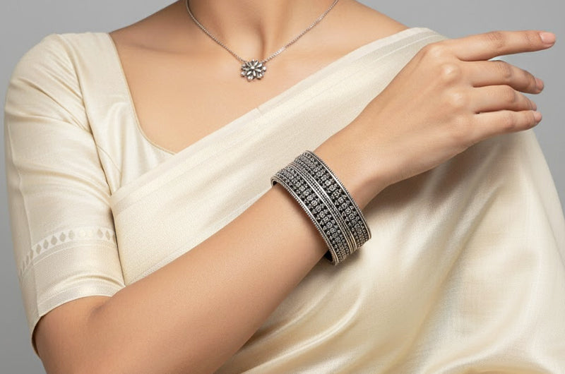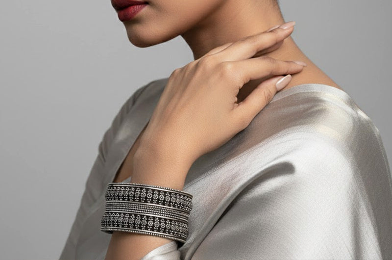 Handcrafted by skilled hill artisans, these bangles showcase meticulous layering and dense surface work. Each piece is carefully formed to preserve the texture and structure of traditional crafts, transforming folk-inspired patterns into durable, wearable silver jewellery for everyday and festive use.