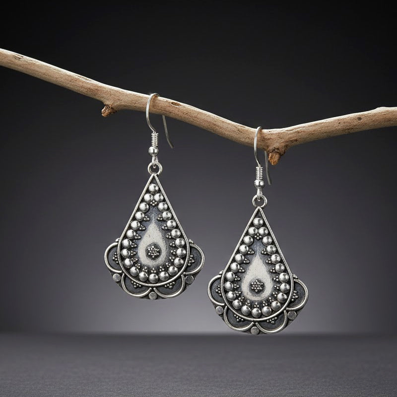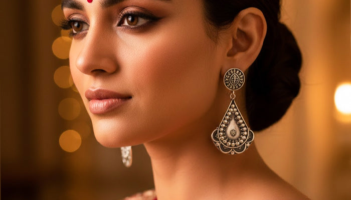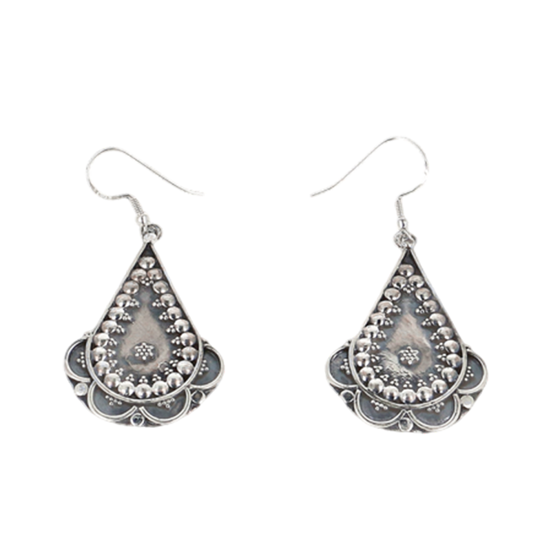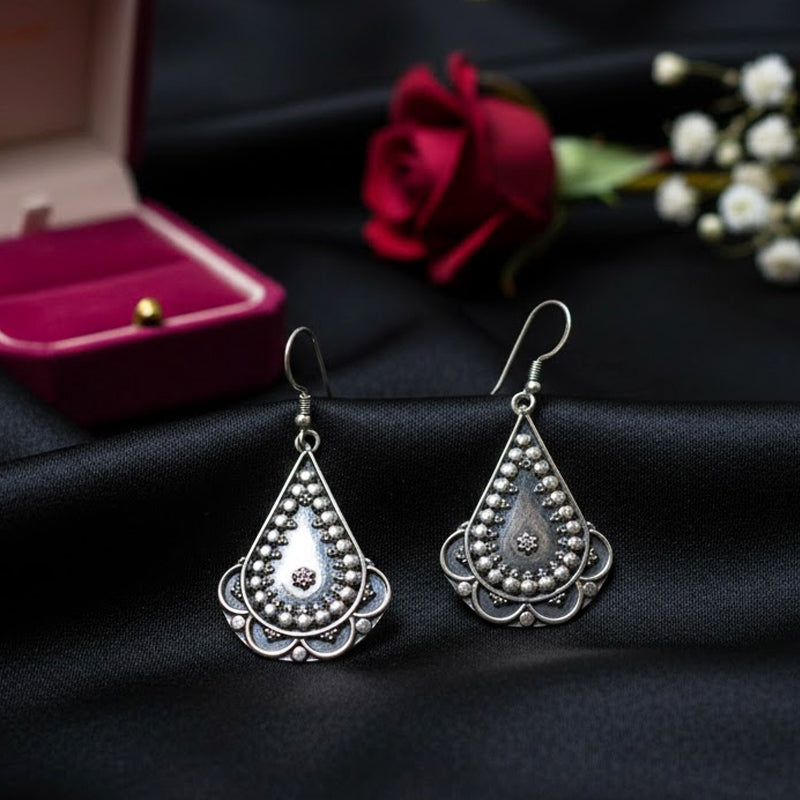 This pattern is a contemporary homage to the ritualistic floor art of the Almora region. The primary plate is a flawless rhombus, painstakingly hand-etched with a central sun wheel and a border of silver granules. At the base, three elongated silver drops are suspended, catching the light with each movement and creating a gentle metallic dance. The rich oxidized finish lends the piece an ancient look, giving it a classy statement for individuals who value traditional craftsmanship.