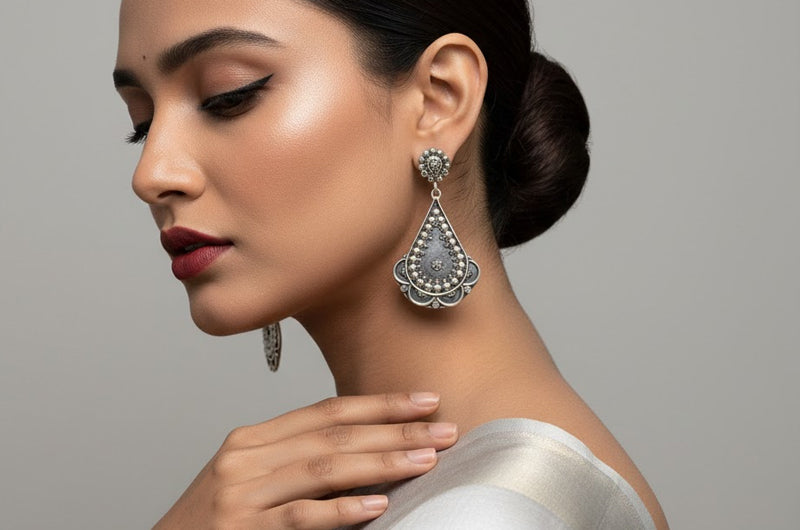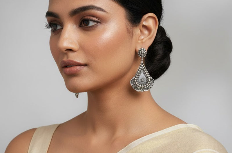 Shaped by skilled hill artisans, this piece highlights precise hand-etching, granulation, and oxidized silver finishing. Each geometric plate and hanging drop is crafted individually, preserving regional techniques that honor Uttarakhand’s ritual art forms while reinterpreting them through a contemporary yet heritage-rich silhouette.