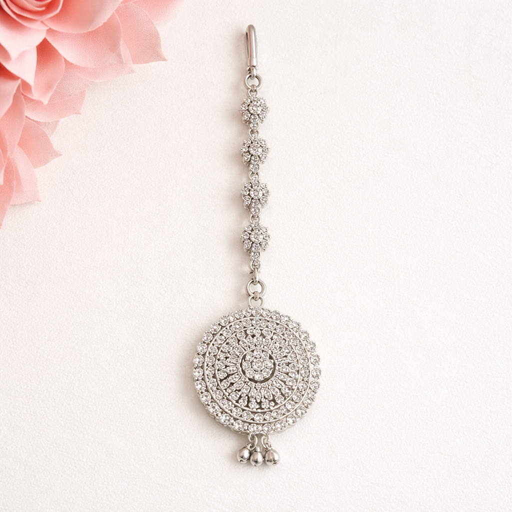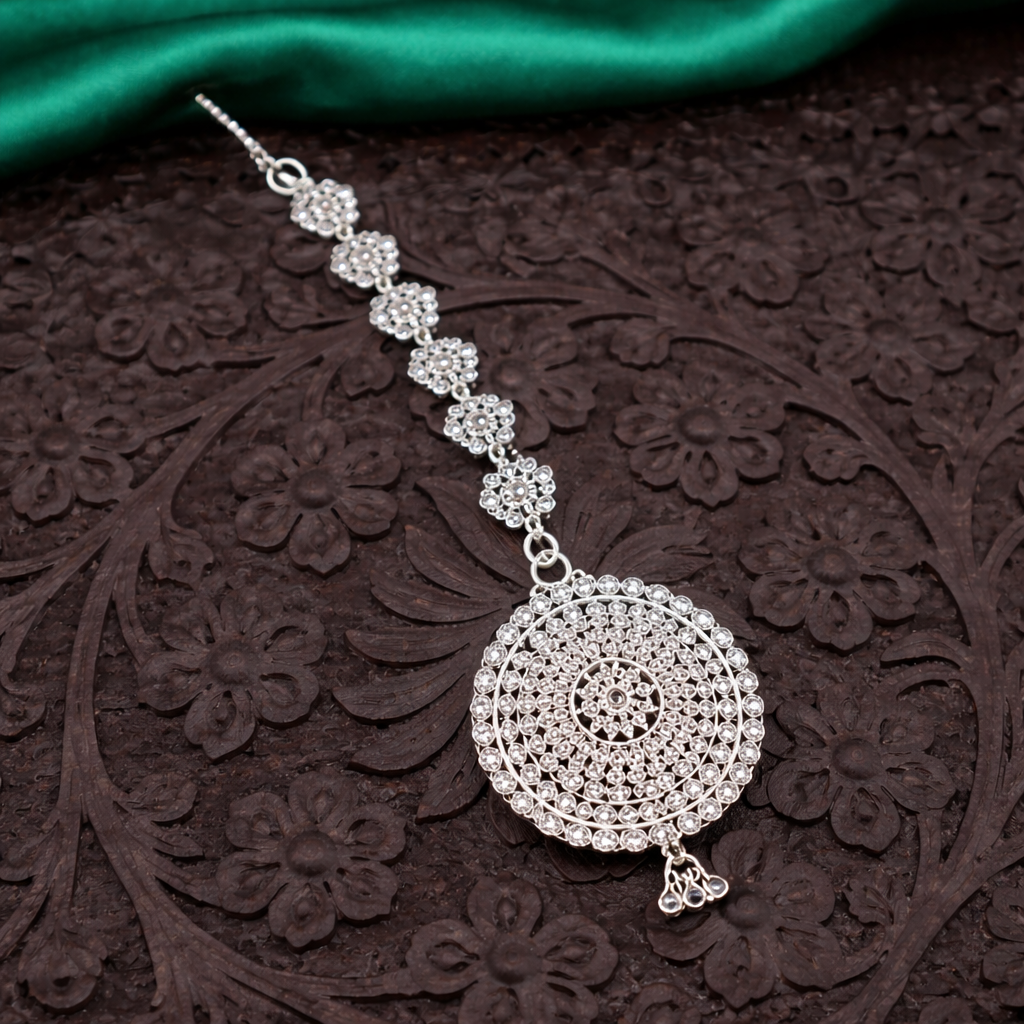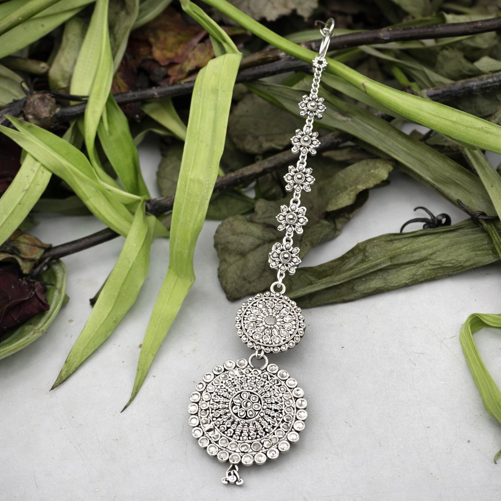 Inspired by symmetrical bridal decorations, this maang tikka features two round mandal-style designs stacked vertically. The design focuses on balance, consistency, and grace. The intricate circular engraving exemplifies superb silver craftsmanship. A lengthy chain creates a magnificent fall across the forehead. Its all-silver design complements both traditional and modern bridal styles.