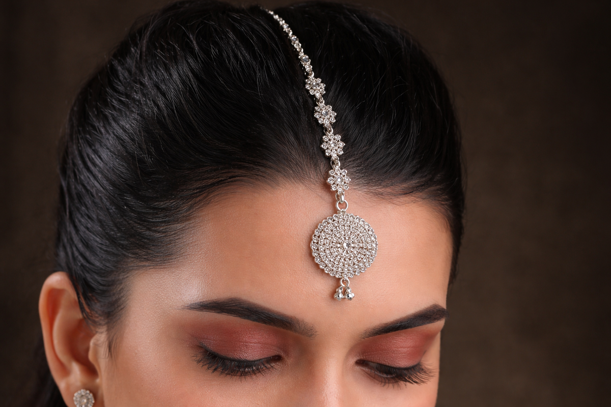 A traditional silver maang tikka modeled after symmetrical twin-mandal bridal decorations.