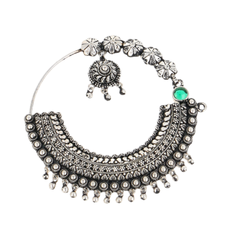 This nath draws influence from the jewelry worn by pahadi brides as symbols of prosperity and dedication. The floral features are inspired by wedding customs in which flowers play an important part, while the crescent body is reminiscent of traditional Kumaoni bridal jewellery. The tiered detailing symbolizes protection and abundance. Delicate silver drips add to its ceremonial splendor. This nath, handcrafted in silver, holds great cultural importance.