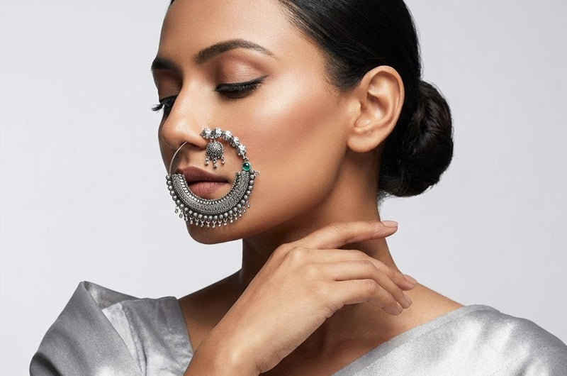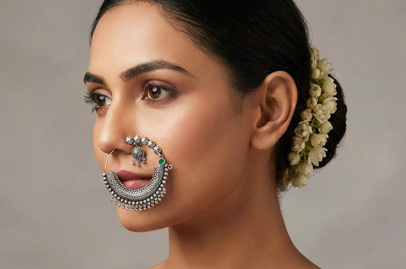 A silver nath inspired by Uttarakhand's traditional marriage and celebration symbols.