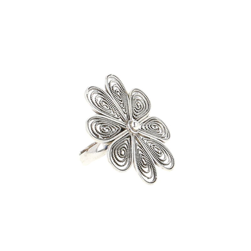 A silver ring with traditional coil techniques and overlapping petal patterns as inspiration.