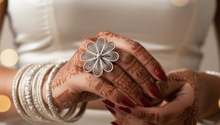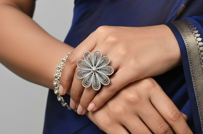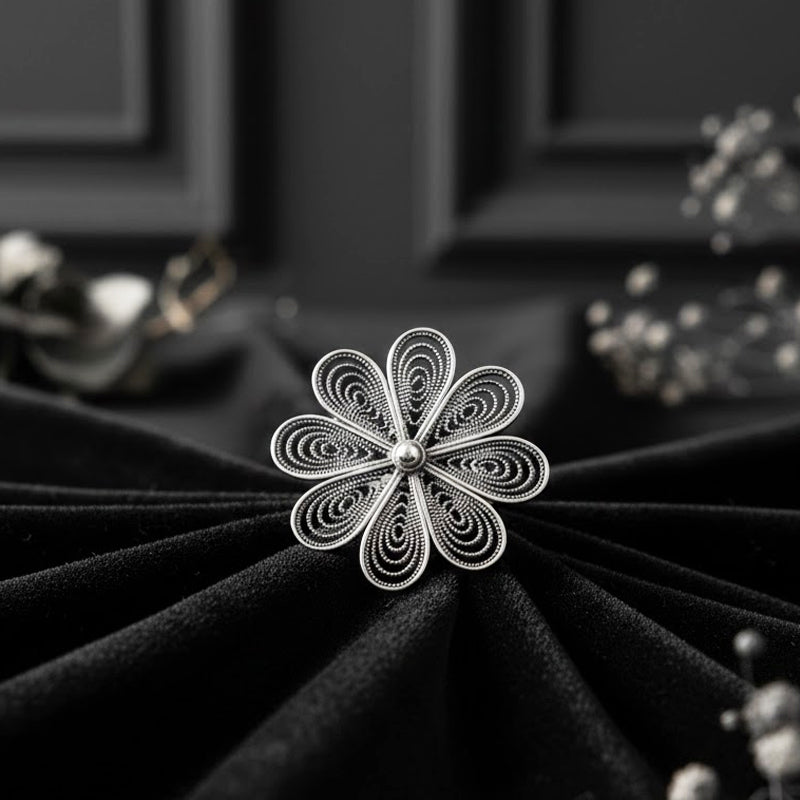 This ring's design, which is based on overlapping petal forms, mimics the organic layering found in pahadi plants. The silversmith's handiwork, in which each curve is formed gradually rather than cast sharply, is highlighted by the coiled detailing. Despite its wide design, the ring's open structure keeps it breezy and wearable. It exudes a feeling of tenderness, development, and artistry derived from the handcrafted customs of Uttarakhand.