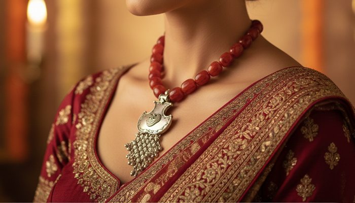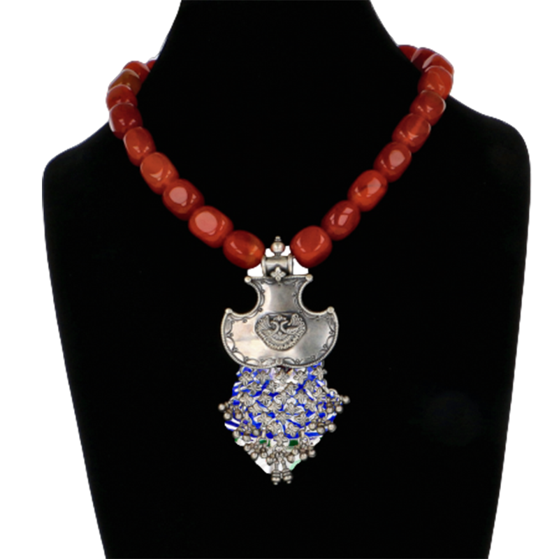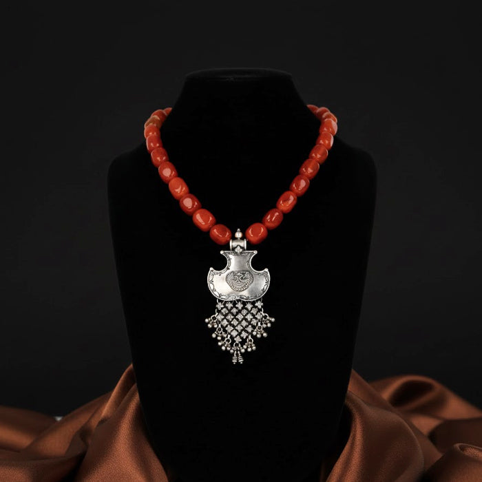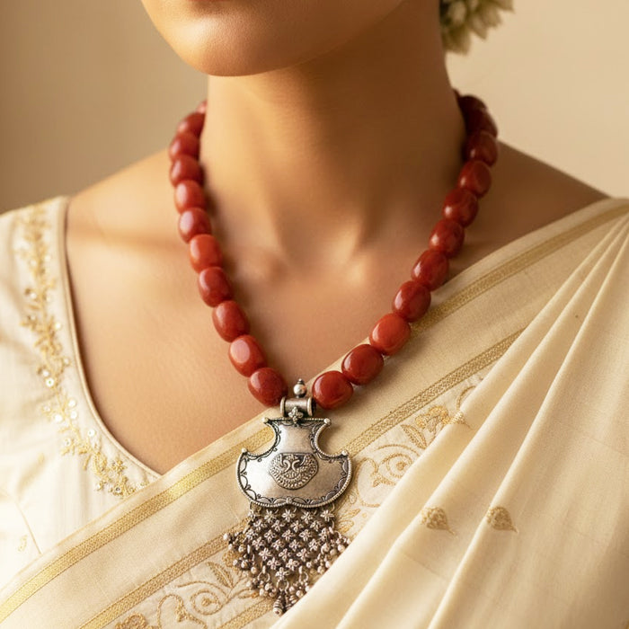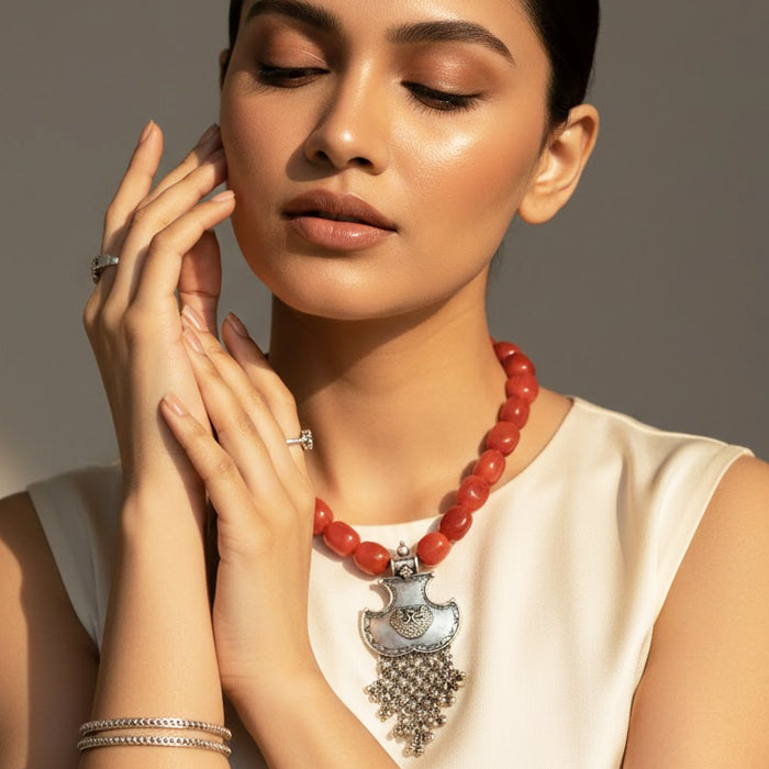 This masterpiece is a heartfelt reworking of the traditional 'Pahadi Munga-Mala', a sign of protection and wealth in the highlands. The necklace is made of excellent, enormous crimson beads that reflect the raw, earthy beauty of the Kumaon forest floor. At its heart is a majestic 'Chhatra-style' silver pendant with a distinct shield-like silhouette and delicate metallic tassels that mirror the beat of a mountain stream. The oxidized vintage finish gives the silver a royal, antique appearance, making it reminiscent of Devbhoomi past. This necklace, complete with a handcrafted adjustable silk ribbon, is the ultimate accessory for the woman who honors her roots with unrivaled elegance and power.