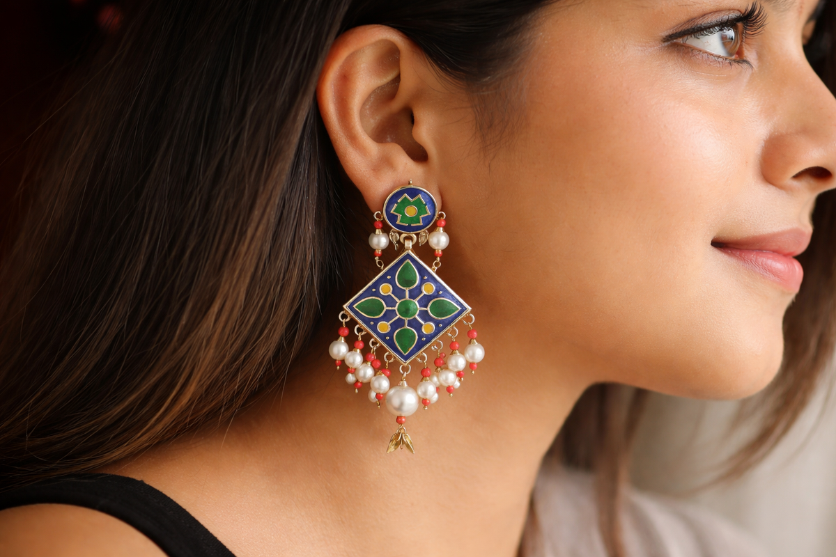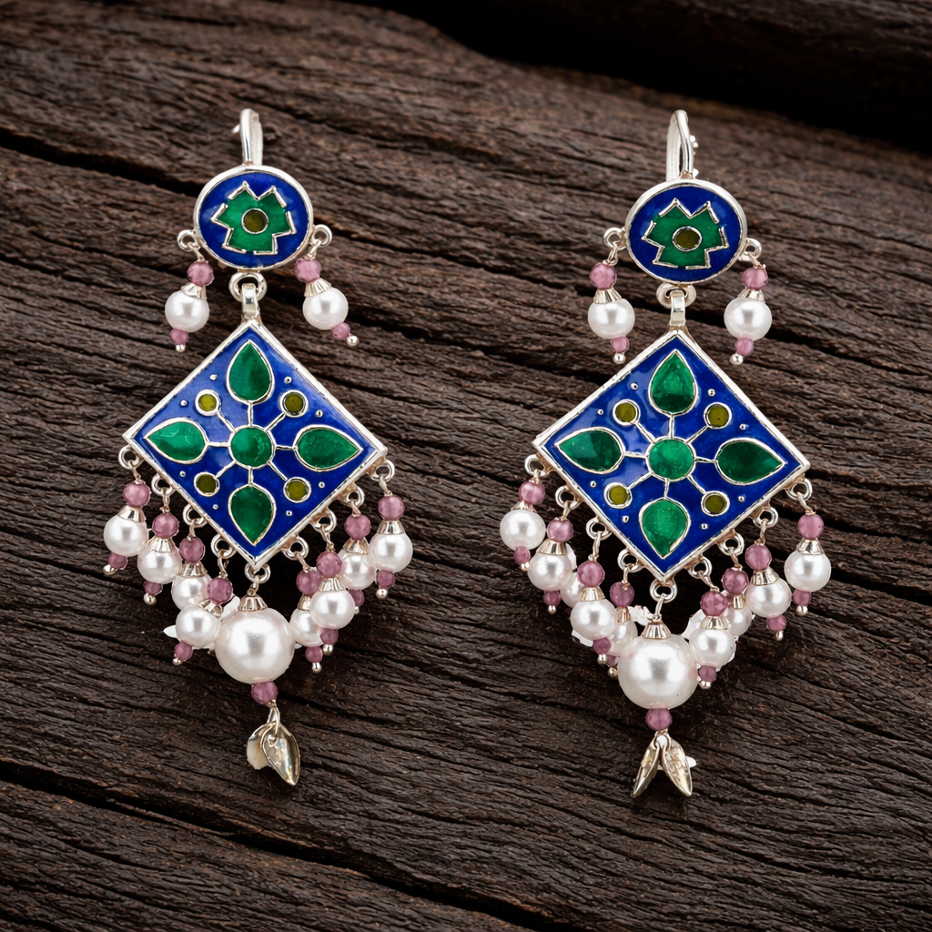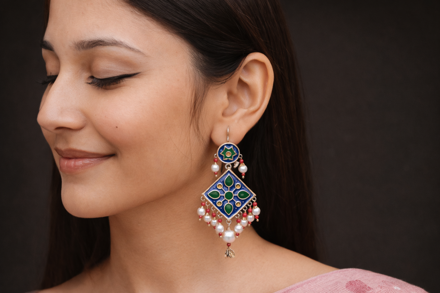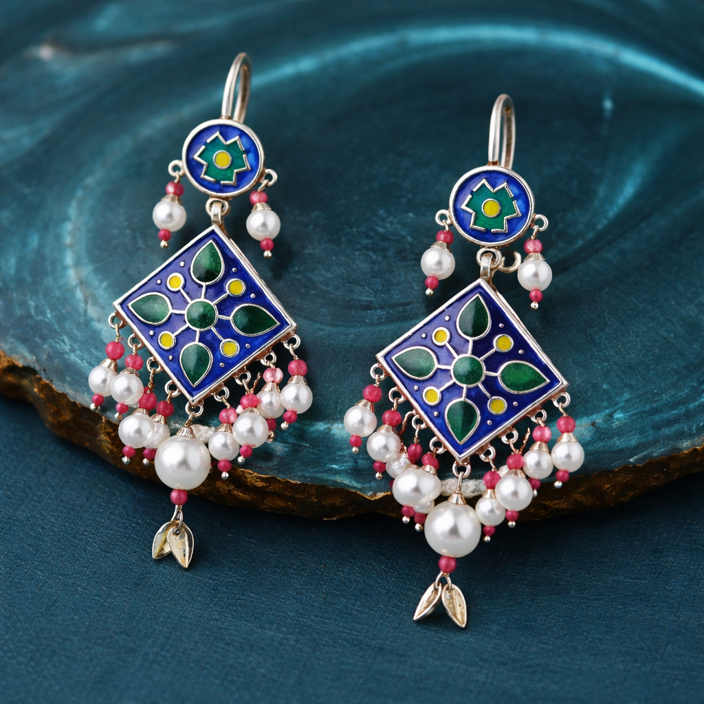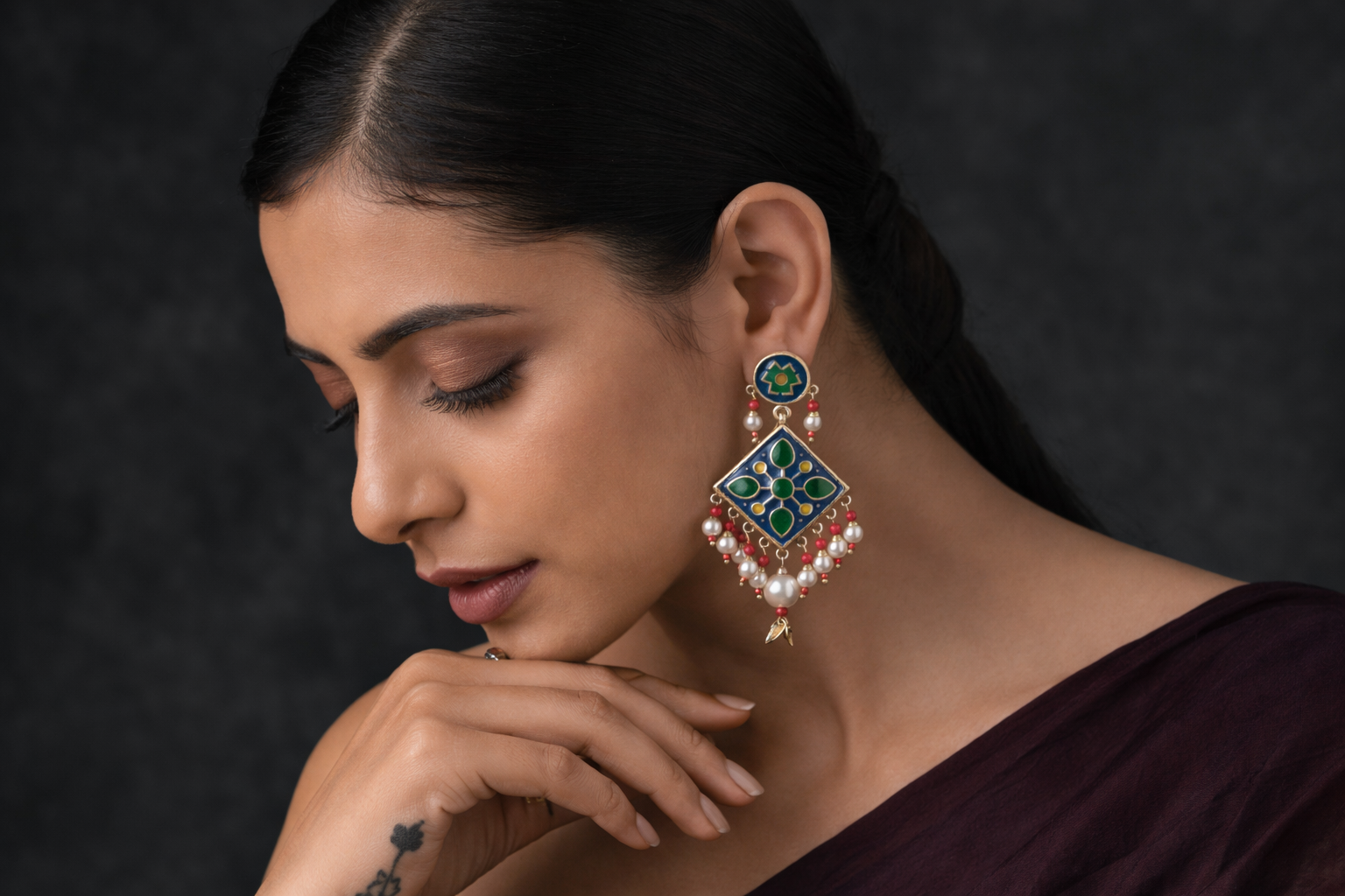 Crafted with detailed meenakari enamel work, each color is carefully hand-filled by skilled artisans. The geometric diamond panel is shaped and polished to achieve balance and symmetry. Every pearl and bead drop is individually attached to ensure smooth, fluid movement. The combination of enamel artistry and handcrafted assembly reflects generations of jewelry-making expertise. A timeless expression of Himalayan-inspired craftsmanship and enduring tradition.