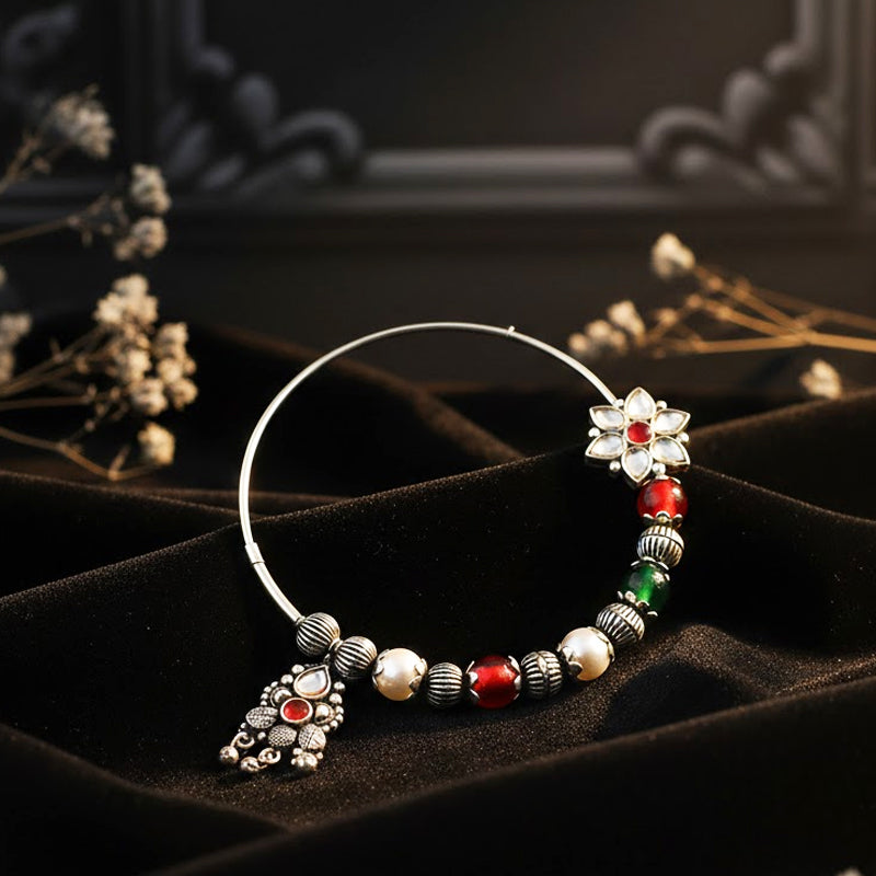 A traditional silver nath inspired by seed-and-bead patterns of Uttarakhand folk jewellery.